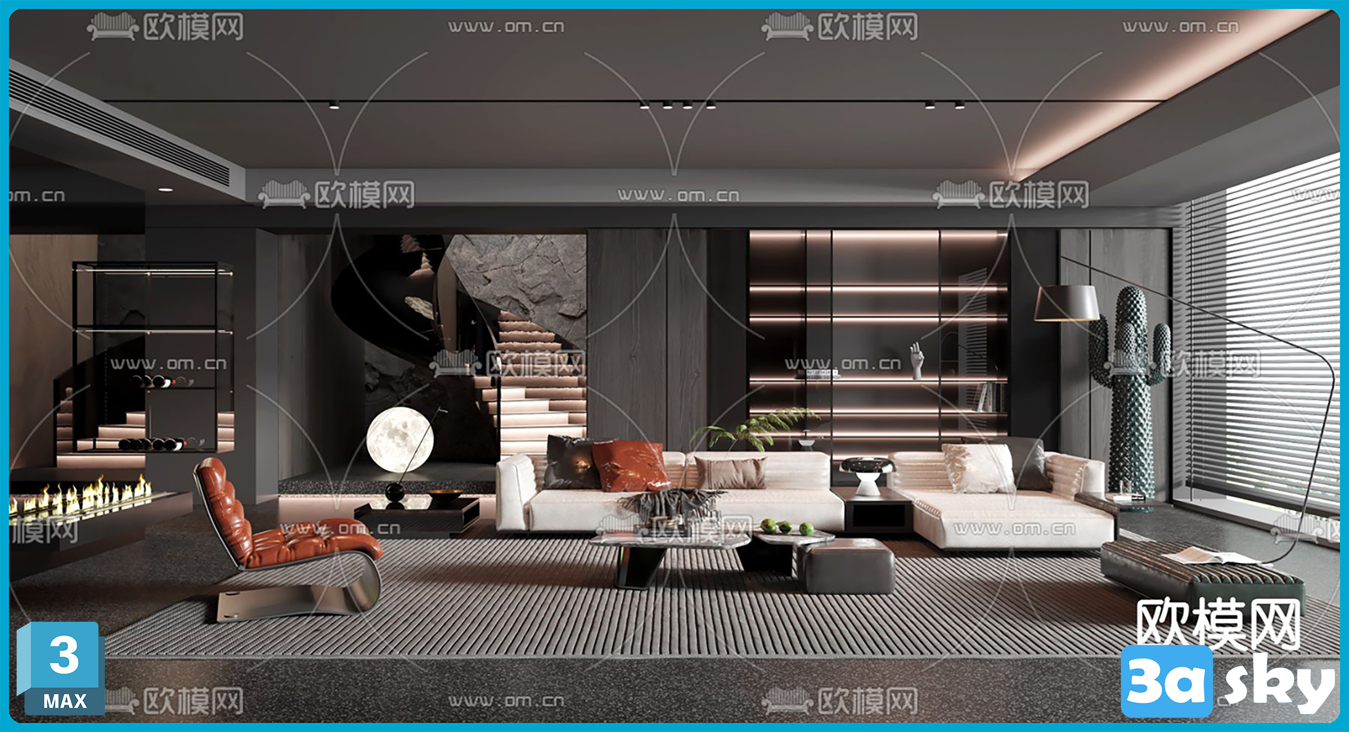 This 3D scene showcases a modern living room interior design with contemporary furniture and decor. The room features a stylish sofa, coffee table, rug, and decorative items. The color scheme is neutral with pops of color for a vibrant look. Perfect for interior design enthusiasts and those seeking inspiration for their own living spaces.