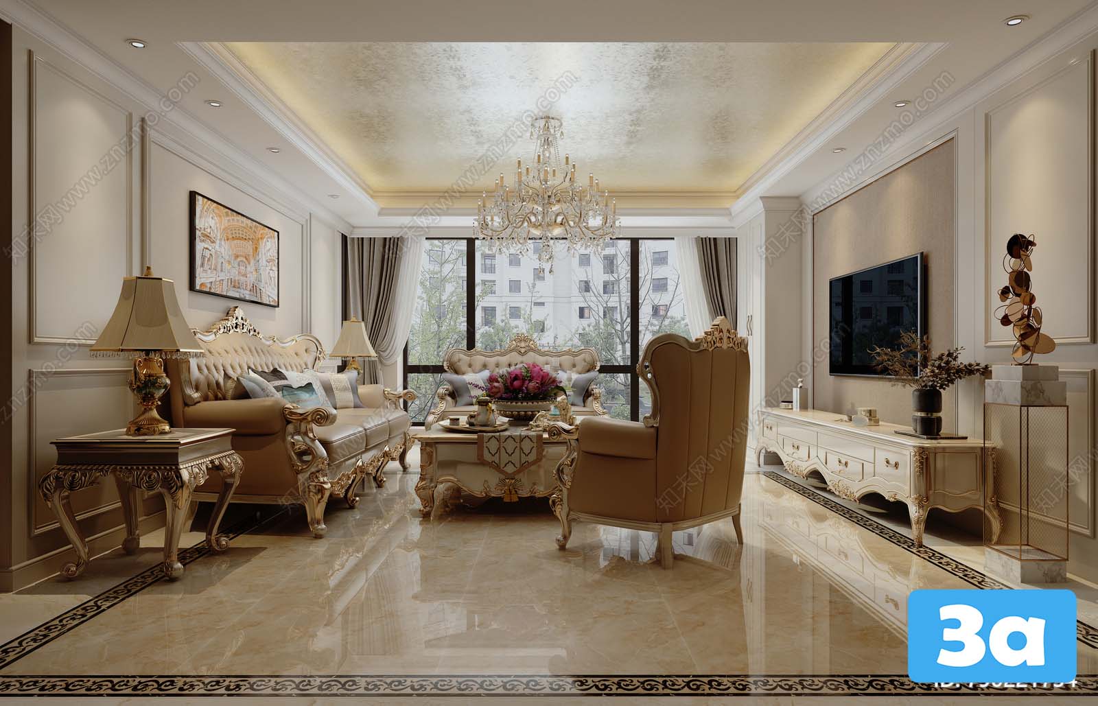 This 3D scene showcases a modern living room interior design with carefully selected furniture and decor. The contemporary layout and stylish elements create a welcoming and aesthetically pleasing space. Explore the details of this design to gather inspiration for your own interior projects.