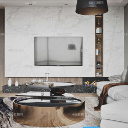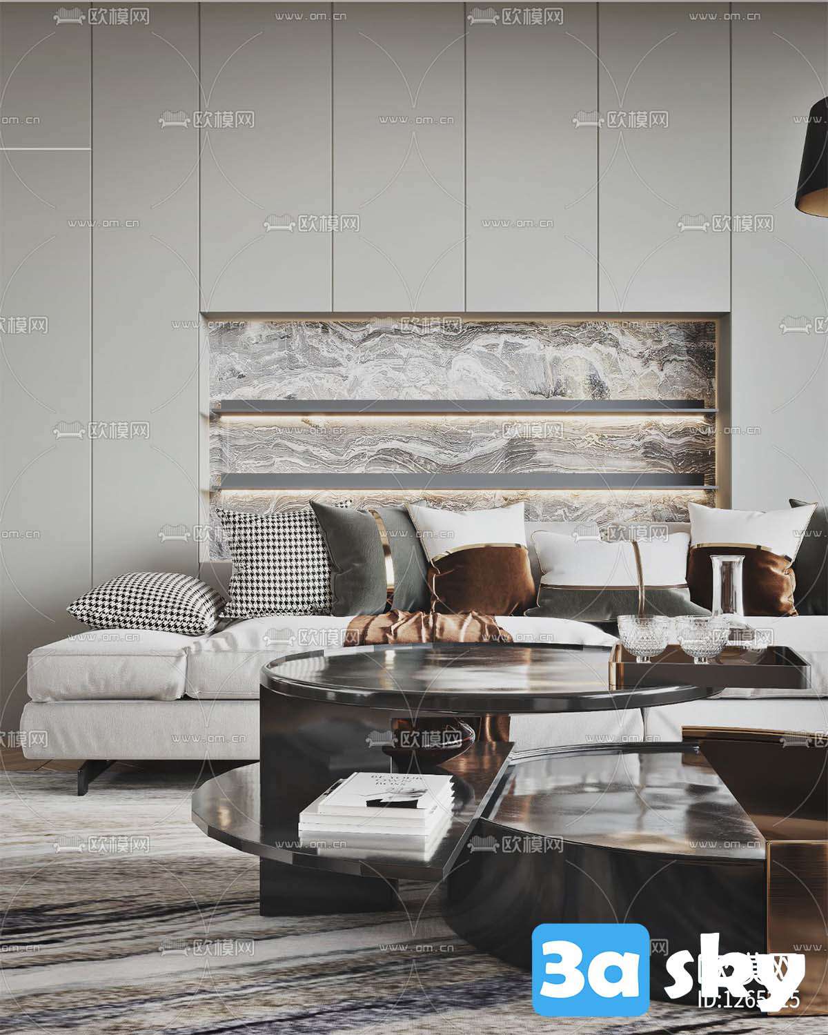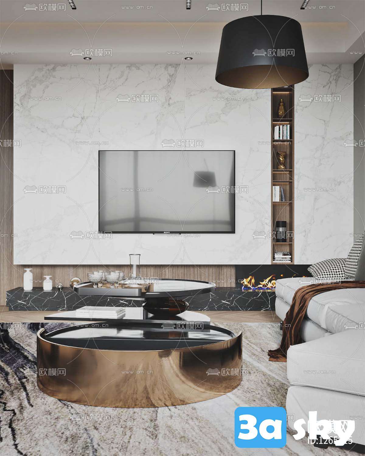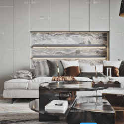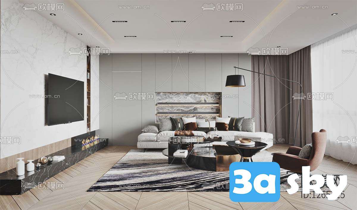 This 3D scene features a modern living room interior design with contemporary furniture and decor elements. The space is elegantly designed with a focus on comfort and style. Explore the details of this beautifully crafted room and get inspired for your own interior design projects.
