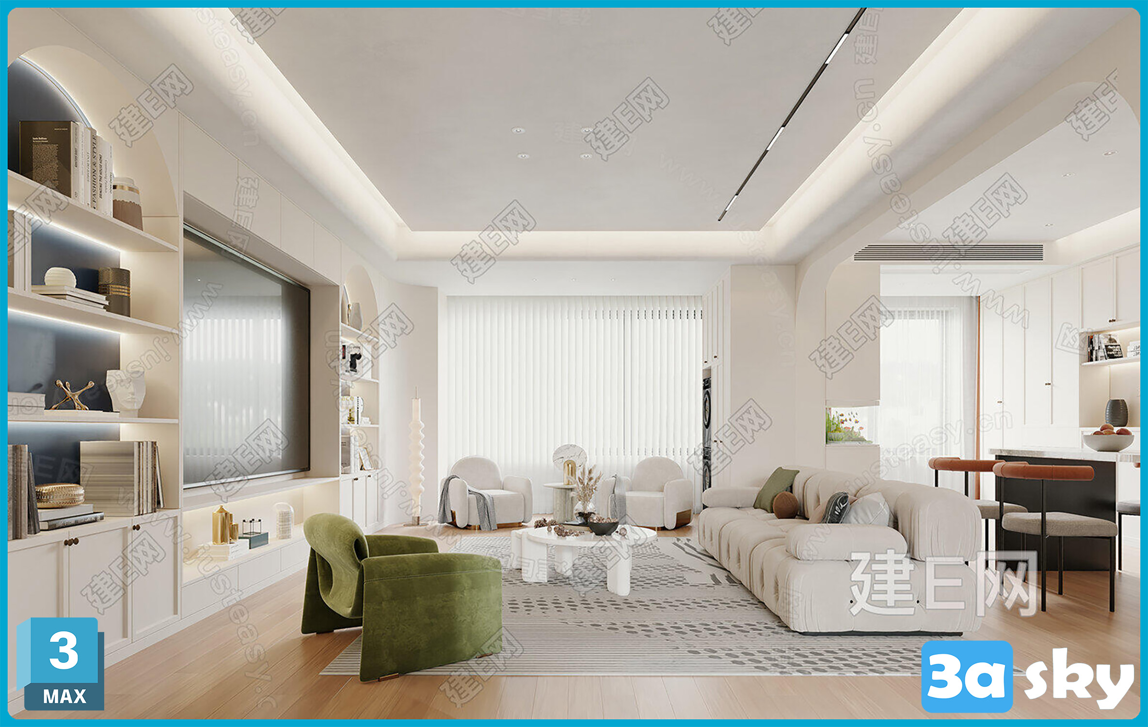 This 3D scene showcases a modern living room interior design with carefully selected furniture and decor. The contemporary layout and design elements create a stylish and inviting space. Explore the details of this 3D scene to gather inspiration for your own interior design projects.