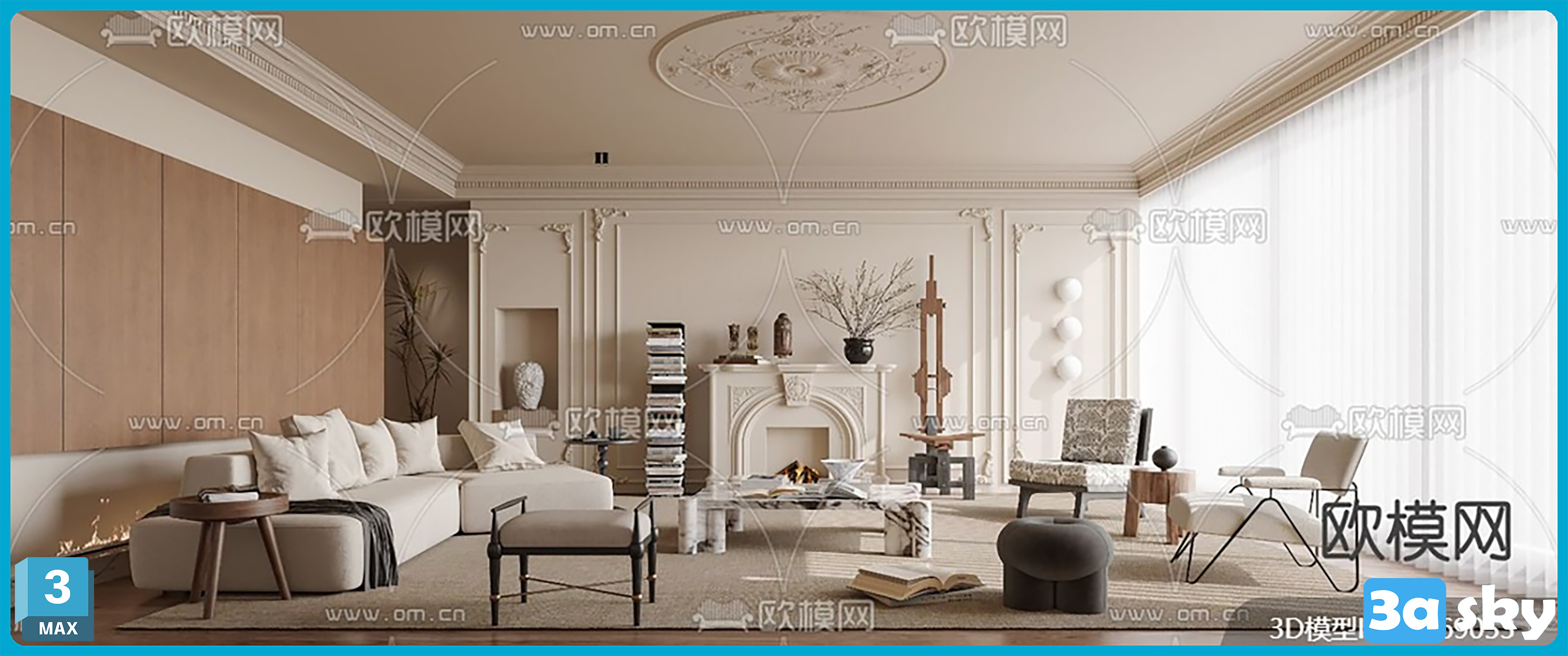 This 3D scene showcases a modern living room interior design with contemporary furniture and decor. The room features a stylish color palette and a cozy ambiance, perfect for inspiration and visualization purposes. Explore the details and design elements in this captivating 3D rendering.