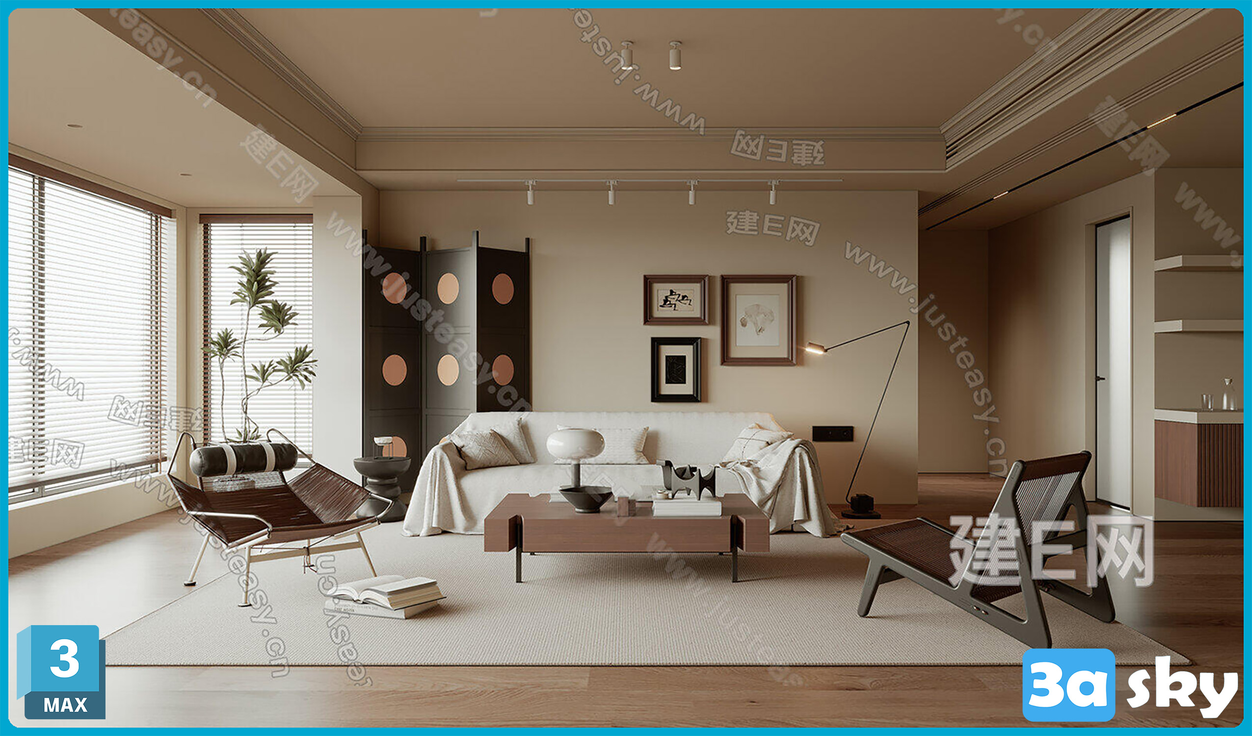 This 3D scene showcases a modern living room interior design with carefully selected furniture and decor. The contemporary layout and style create a welcoming and stylish space for relaxation and entertainment. Explore the details of this design to gather inspiration for your own living room decor projects.
