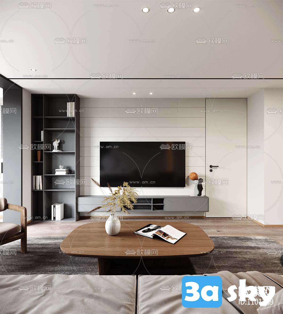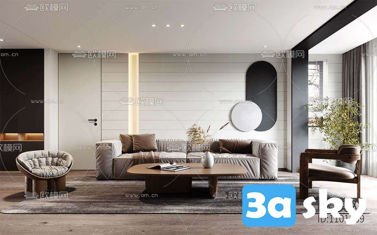 This 3D scene features a modern living room interior design with contemporary furniture and decor. The space is elegantly designed with a focus on comfort and style. Explore the details of this beautifully crafted room and get inspired for your own interior design projects.