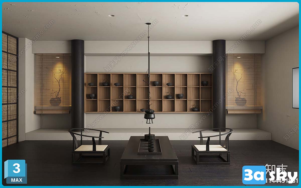 This 3D scene showcases a modern living room interior design with stylish furniture and contemporary decor. The scene is designed to provide a realistic preview of a well-furnished and aesthetically pleasing living space.