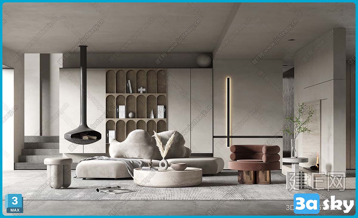 This 3D scene showcases a modern living room interior design with carefully selected furniture and decor. The contemporary layout and design elements create a stylish and inviting space. Explore the details of this 3D scene to gather inspiration for your own interior design projects.