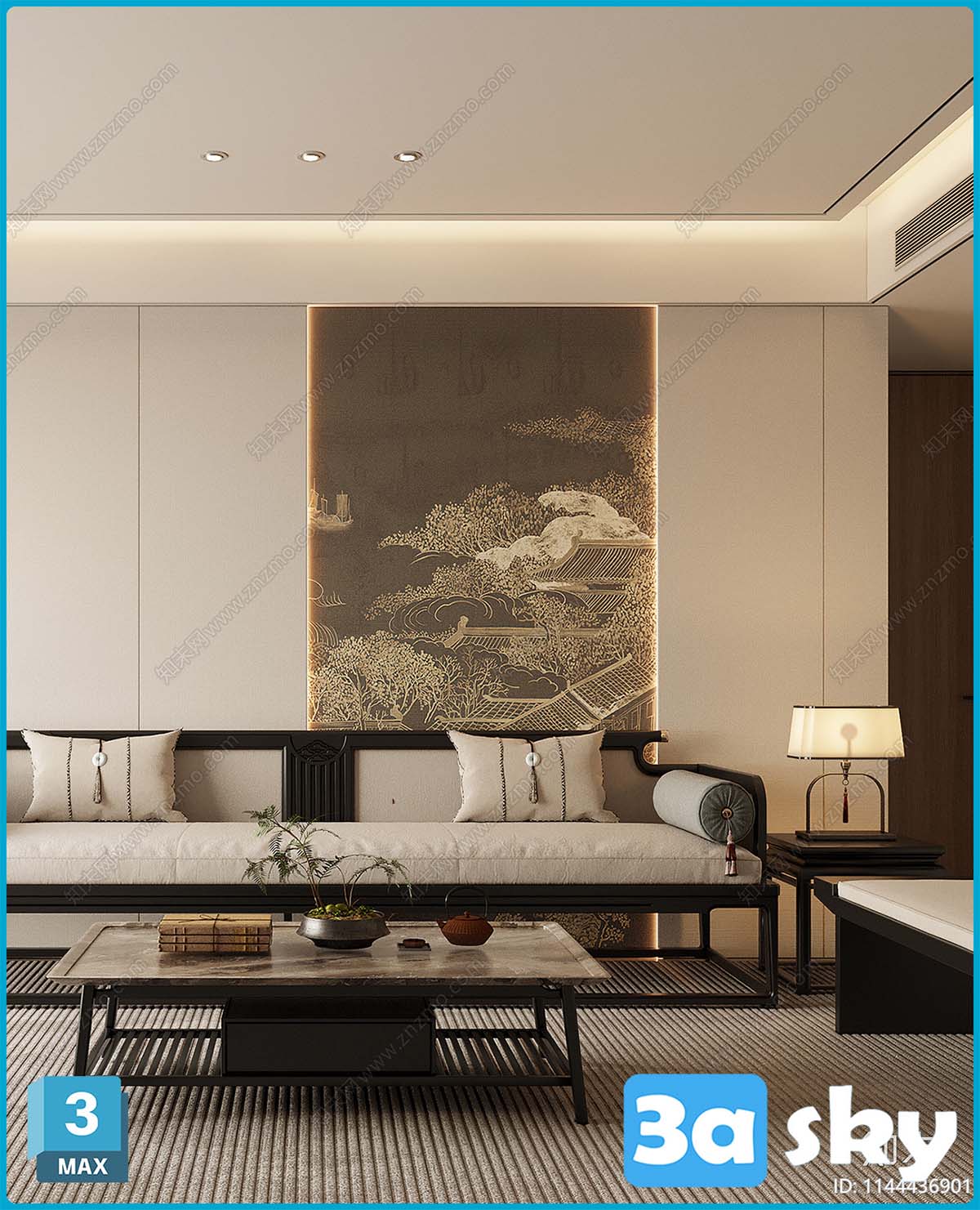 This 3D scene showcases a modern living room interior design with carefully selected furniture and decor. The space is elegantly designed with a focus on contemporary aesthetics and functionality. Explore this preview to get a glimpse of the detailed elements and layout of the room.
