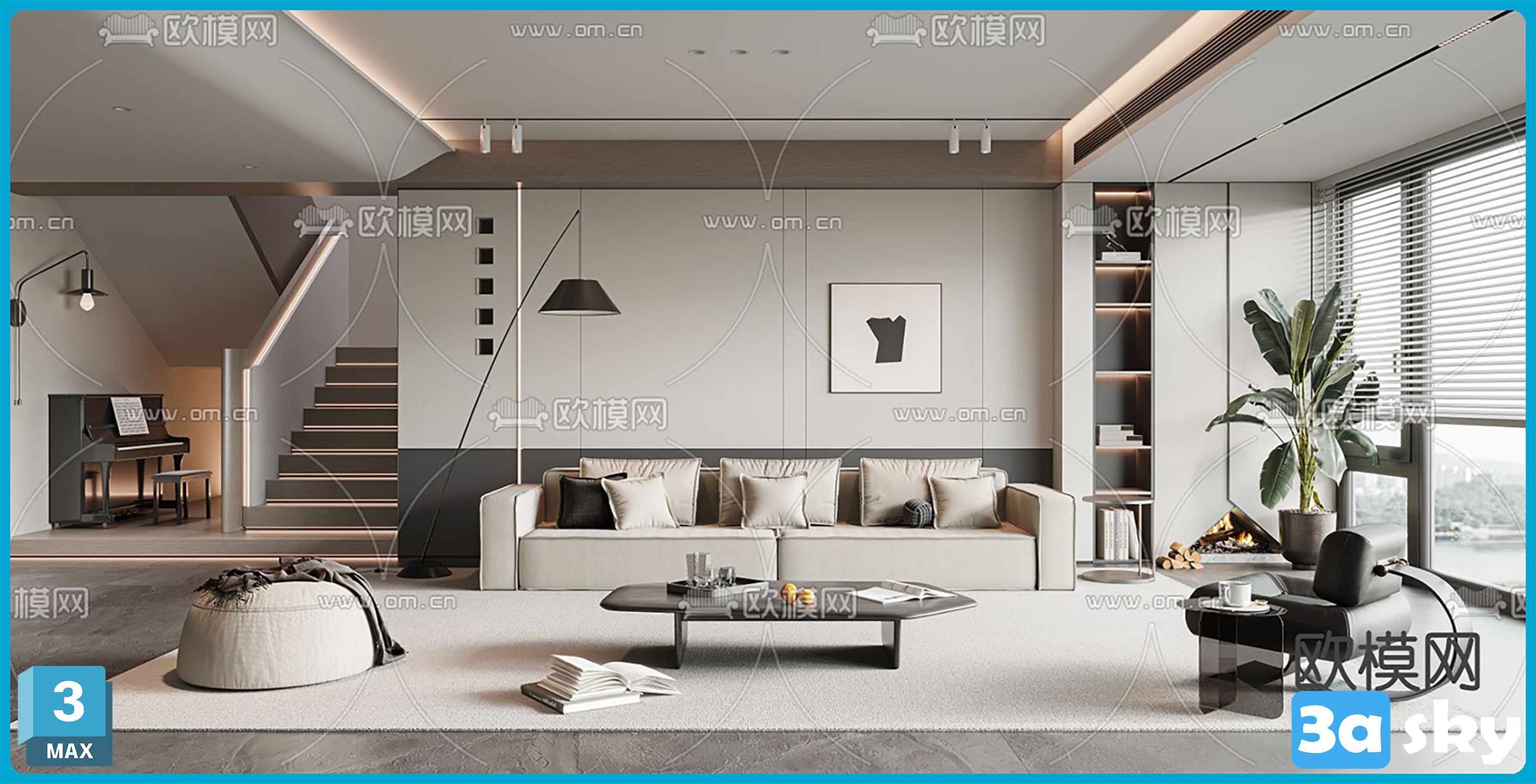 This 3D scene features a modern living room interior design with contemporary furniture and decor. The space is elegantly designed with a focus on comfort and style. Explore the details of this beautifully crafted room and get inspired for your own interior design projects.