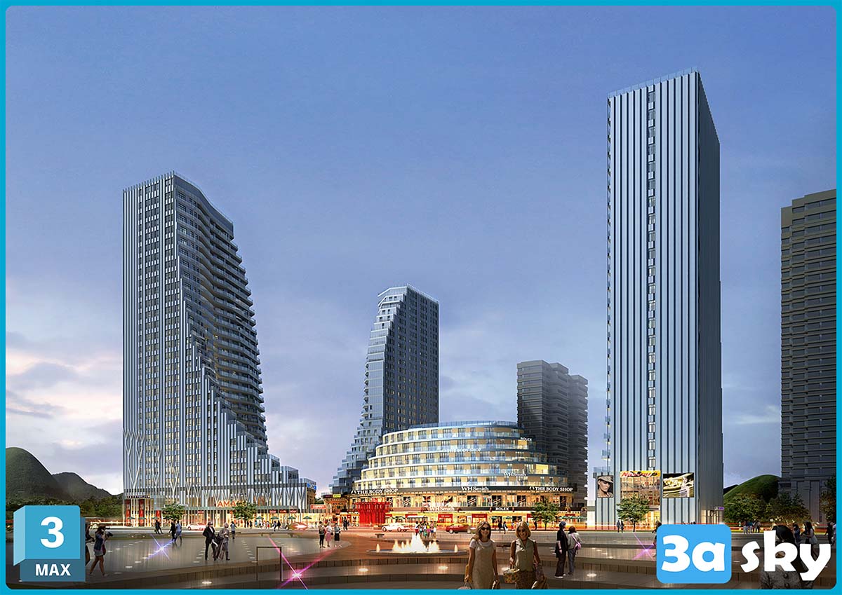 This 3D scene showcases a modern living room interior design with contemporary furniture and decor. The room features a sleek and stylish layout, creating a welcoming and cozy atmosphere. Explore the details of the furniture pieces and decor elements in this beautifully designed space.