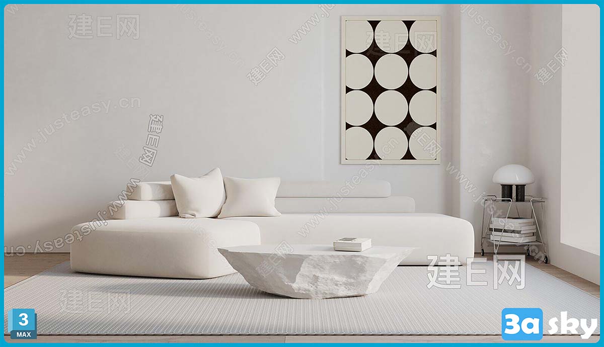 This 3D scene showcases a modern living room interior design with carefully selected furniture and decor. The contemporary layout and design elements create a stylish and inviting space for relaxation and entertainment. Explore the details of this 3D scene to gather inspiration for your own interior design projects.