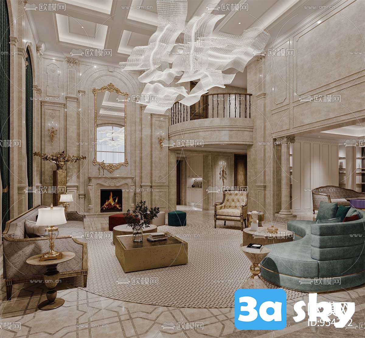 This 3D scene showcases a modern living room interior design with contemporary furniture and decor. The room features a stylish sofa, coffee table, rug, and decorative items. Perfect for inspiration and visualization projects.