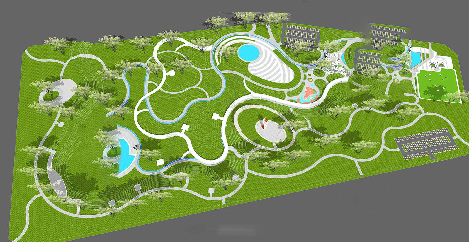 This 3D scene features a park with lush greenery, trees, benches, and pathways, creating a serene outdoor environment. The detailed design captures the essence of a peaceful park setting, perfect for architectural visualization and landscape planning projects.