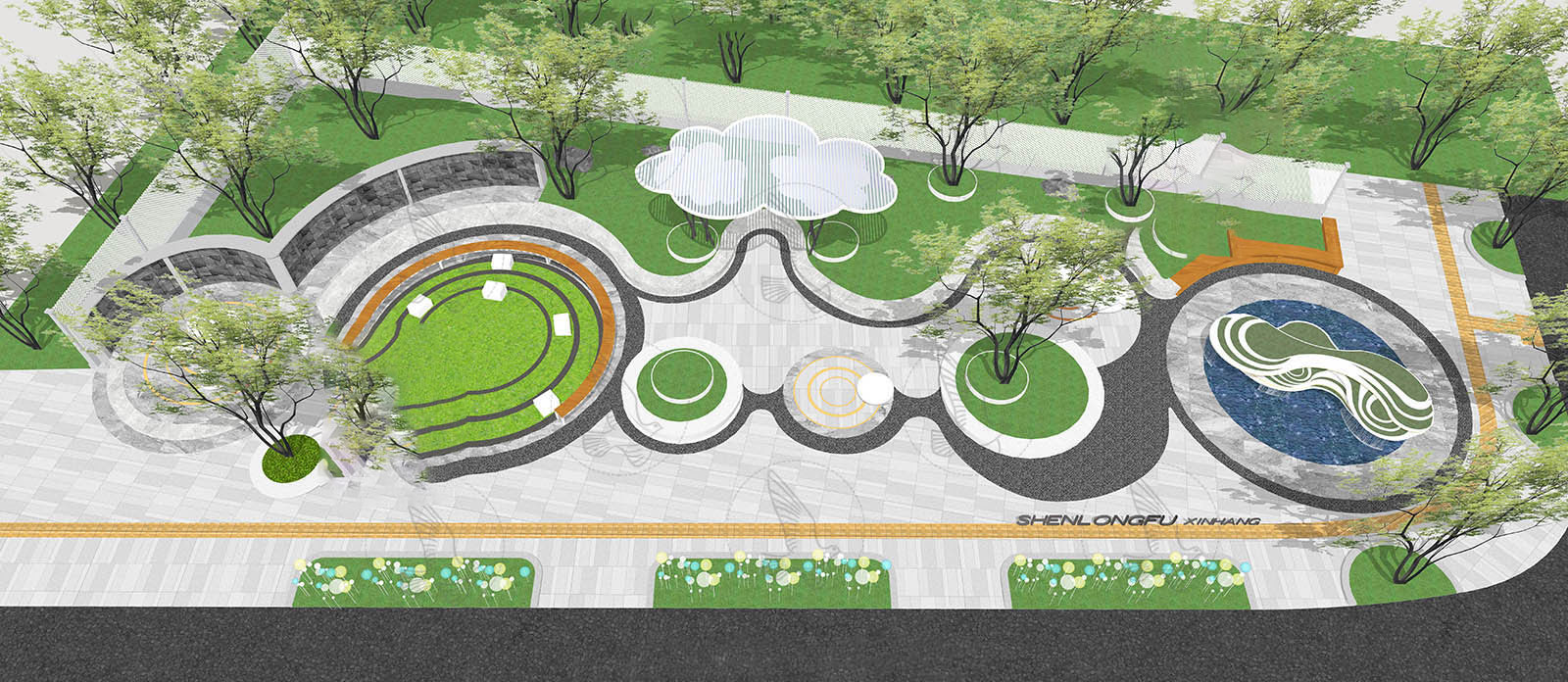 This 3D scene showcases a park share design in SketchUp. The image features a detailed outdoor space with trees, benches, and pathways. Explore the beauty and functionality of this park share design for your own inspiration.