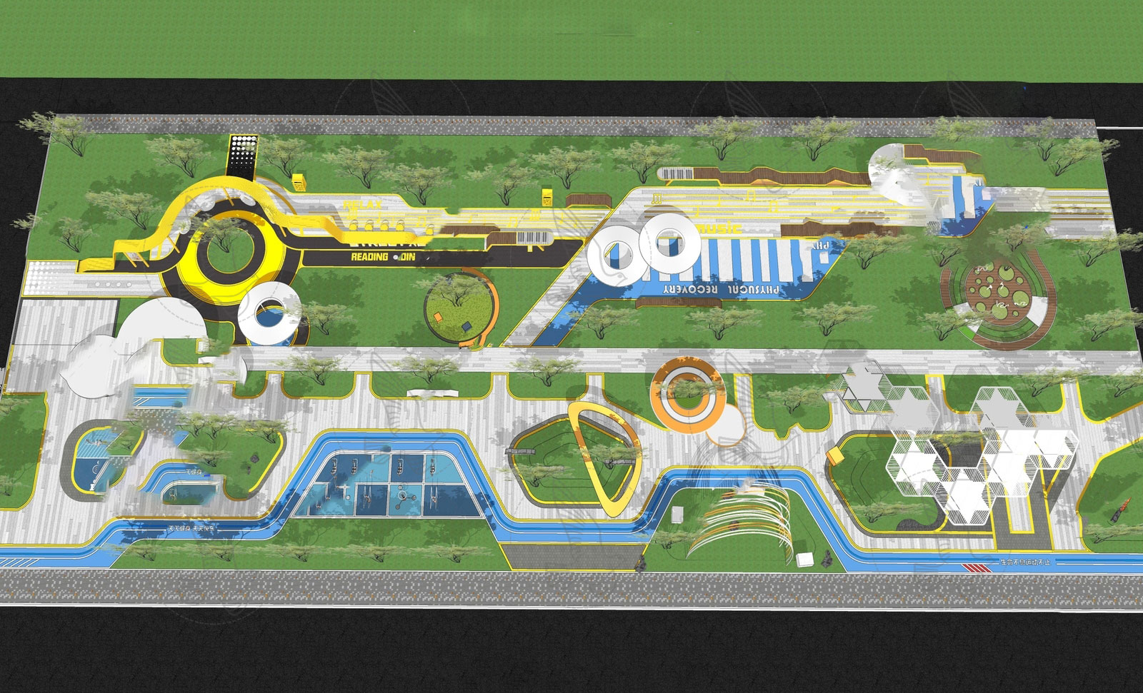 This 3D scene showcases a beautifully designed outdoor park share. The scene features intricate landscaping elements and design details, creating a serene and inviting outdoor space. Explore the beauty of this park design and get inspired for your own outdoor projects.