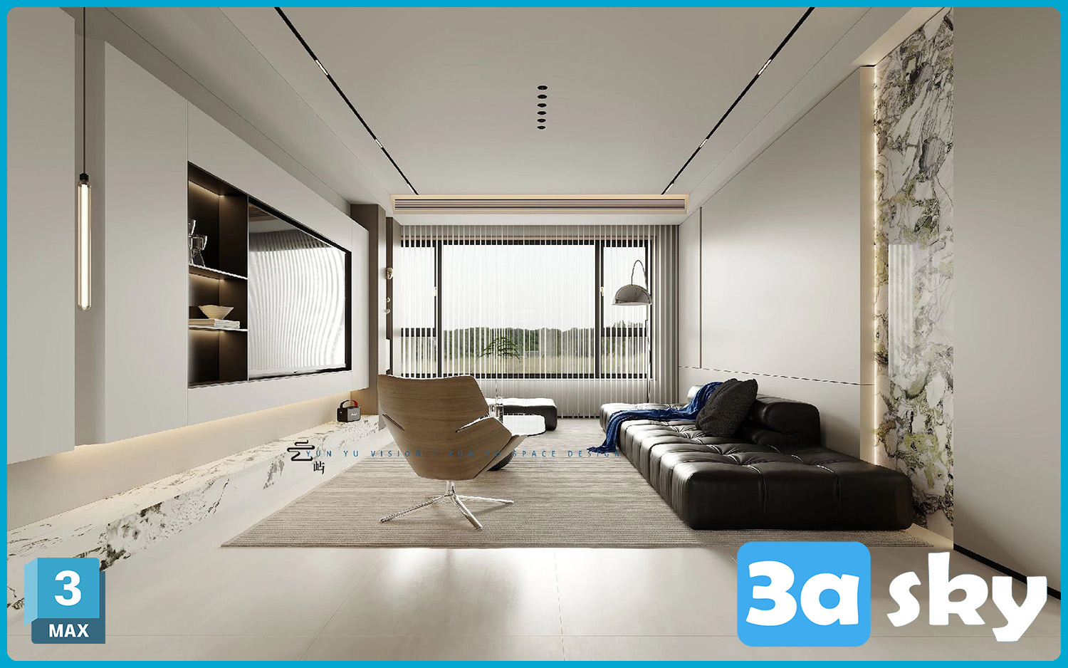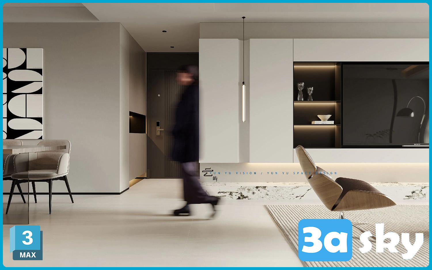This 3D scene preview showcases a modern home interior design, featuring a stylish living room with contemporary furniture and home decor. The scene is meticulously crafted in 3DS MAX, offering a glimpse into a beautifully designed living space.