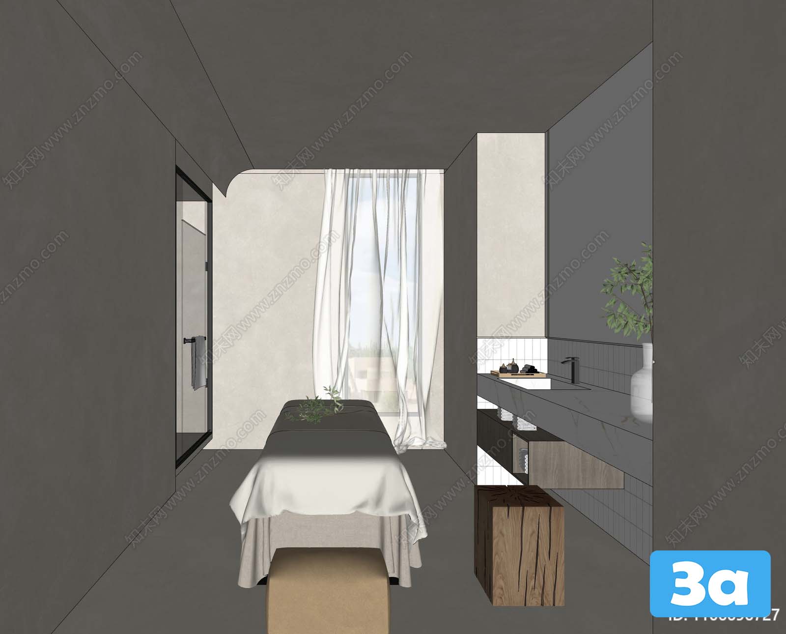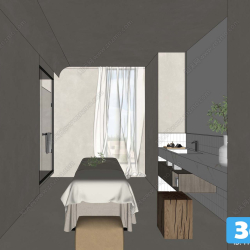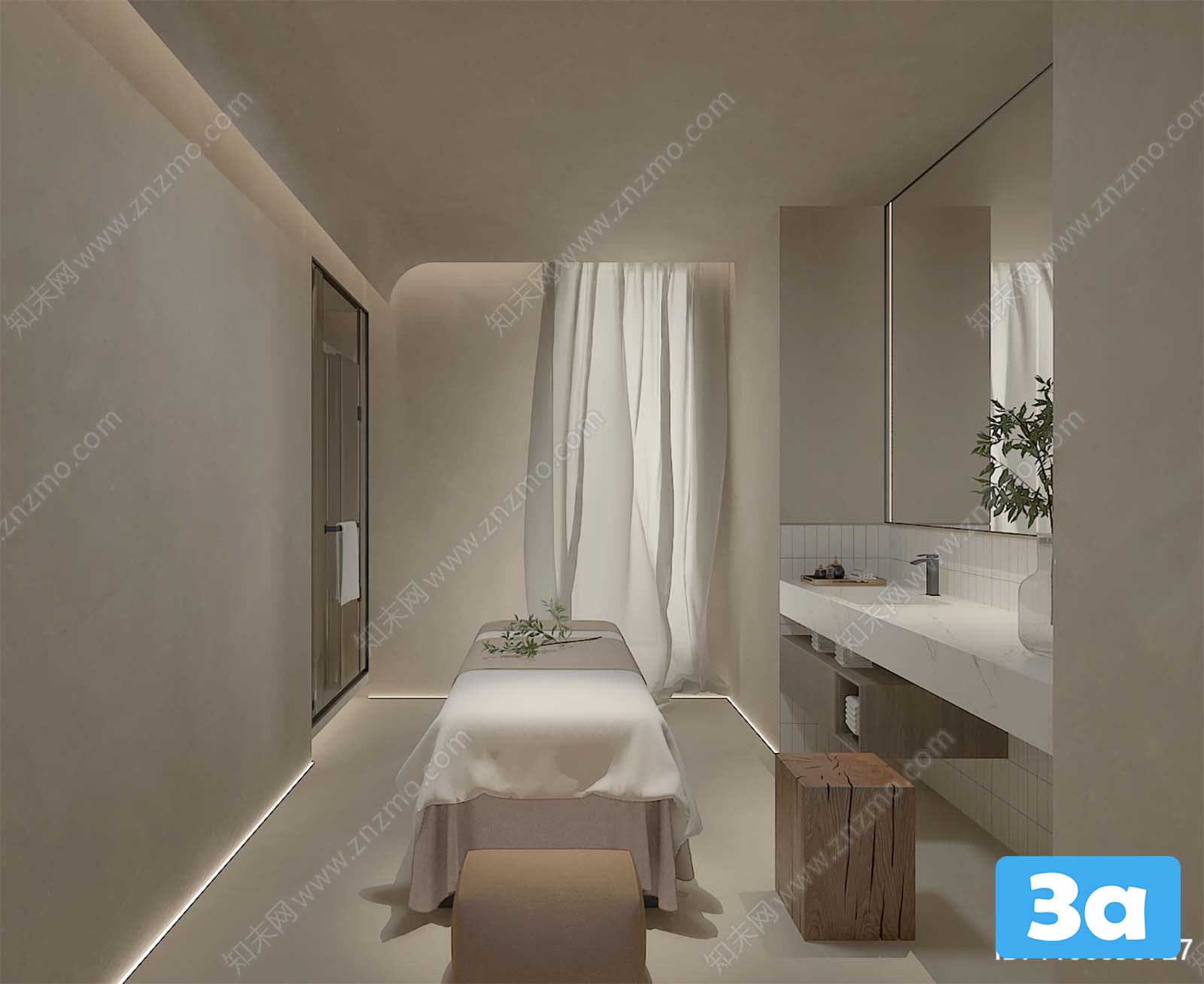 This 3D scene depicts a spa environment with a focus on relaxation and modern design elements. The visualization showcases a serene setting with carefully curated details to create a calming atmosphere. Explore this 3D scene to immerse yourself in a tranquil spa experience.