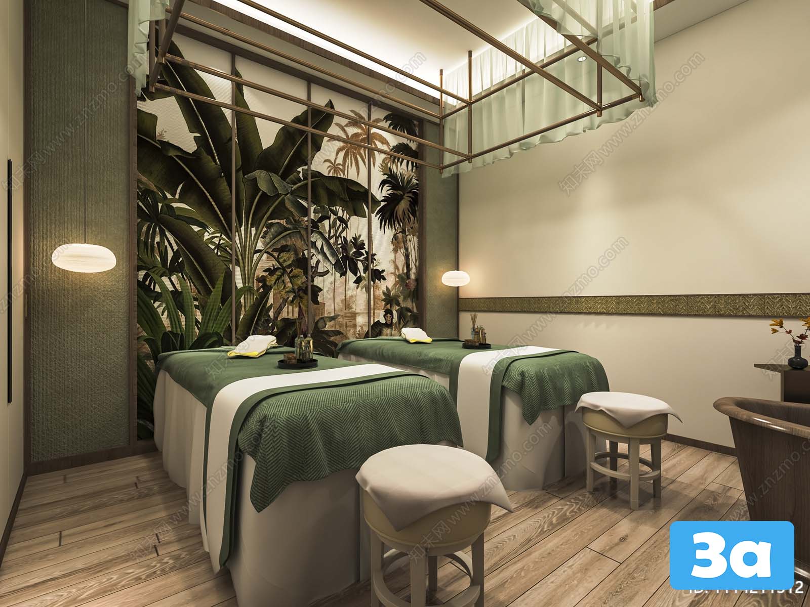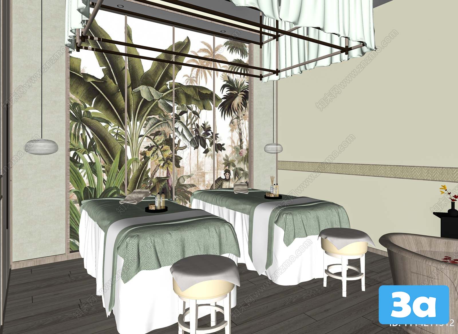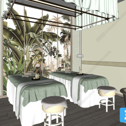 This 3D scene depicts a spa environment designed for relaxation and tranquility. The visualization captures the serene atmosphere of a spa with its intricate details and calming ambiance. Explore this 3D scene to immerse yourself in a world of relaxation and rejuvenation.
