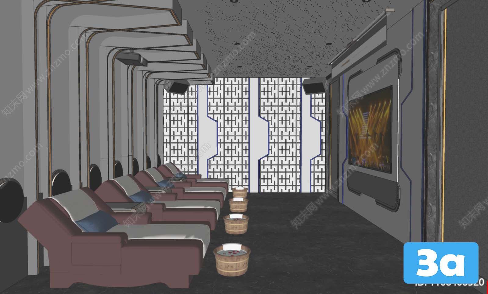 This 3D scene depicts a luxurious spa environment with a focus on relaxation and tranquility. The design features intricate details and a serene atmosphere, perfect for inspiring interior design ideas. Immerse yourself in this visualization and let the calming ambiance transport you to a world of peace and rejuvenation.