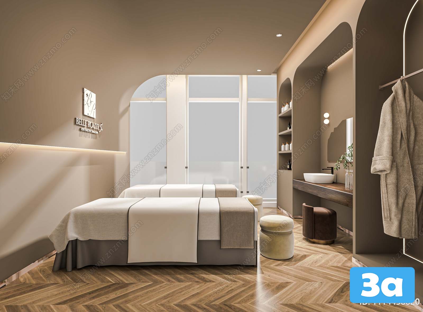 This 3D scene depicts a spa environment designed for relaxation and tranquility. The visualization showcases intricate details of the spa, including soothing lighting, comfortable seating, and lush greenery. Immerse yourself in this serene atmosphere and get inspired for your own interior design projects.