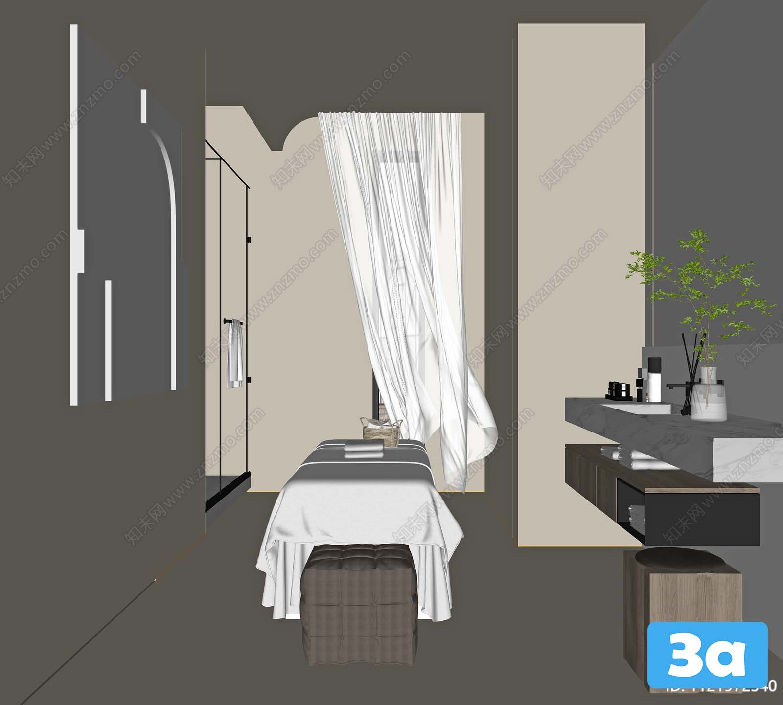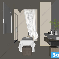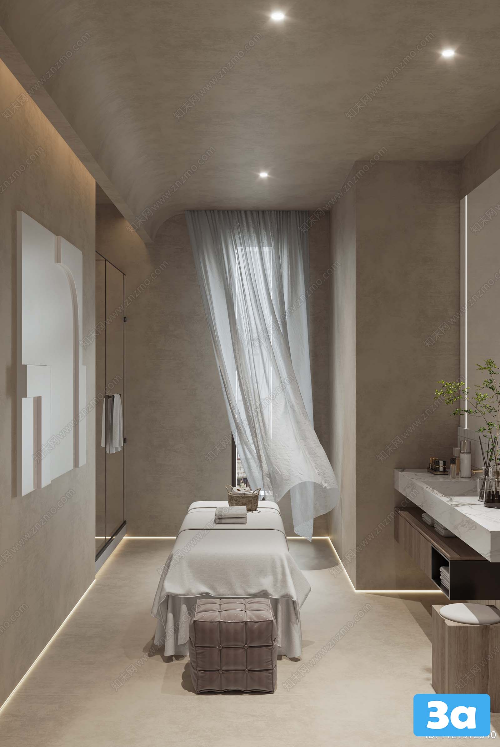 This 3D scene depicts a spa environment designed for relaxation and tranquility. The visualization captures the serene atmosphere of a spa, with detailed elements that enhance the overall experience. Explore this 3D scene to immerse yourself in a calming and peaceful setting.