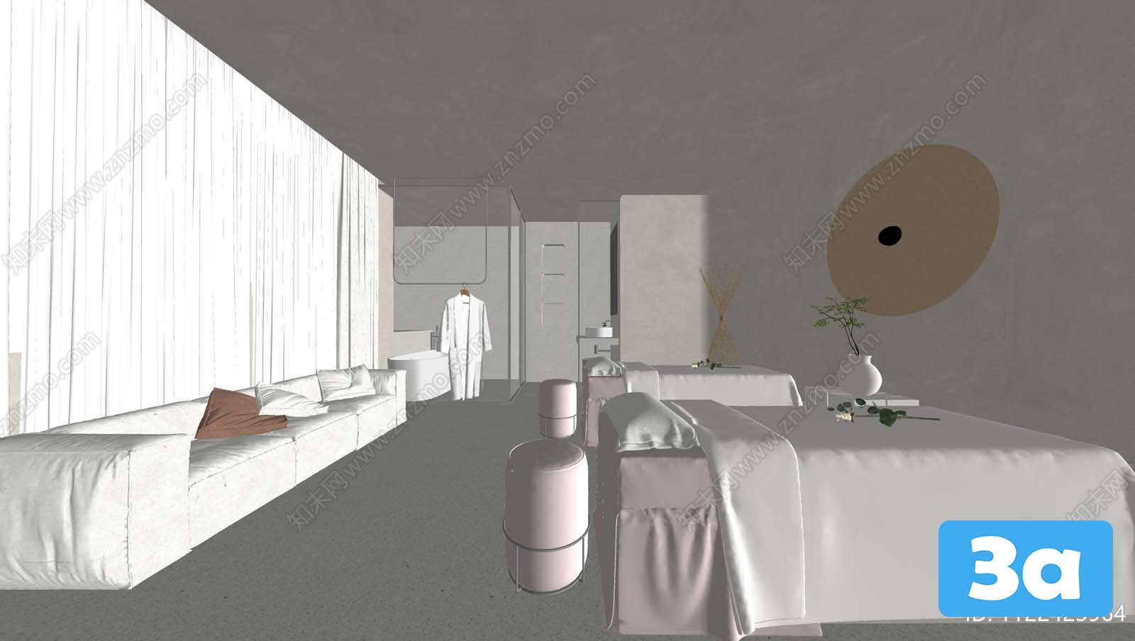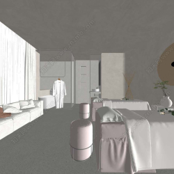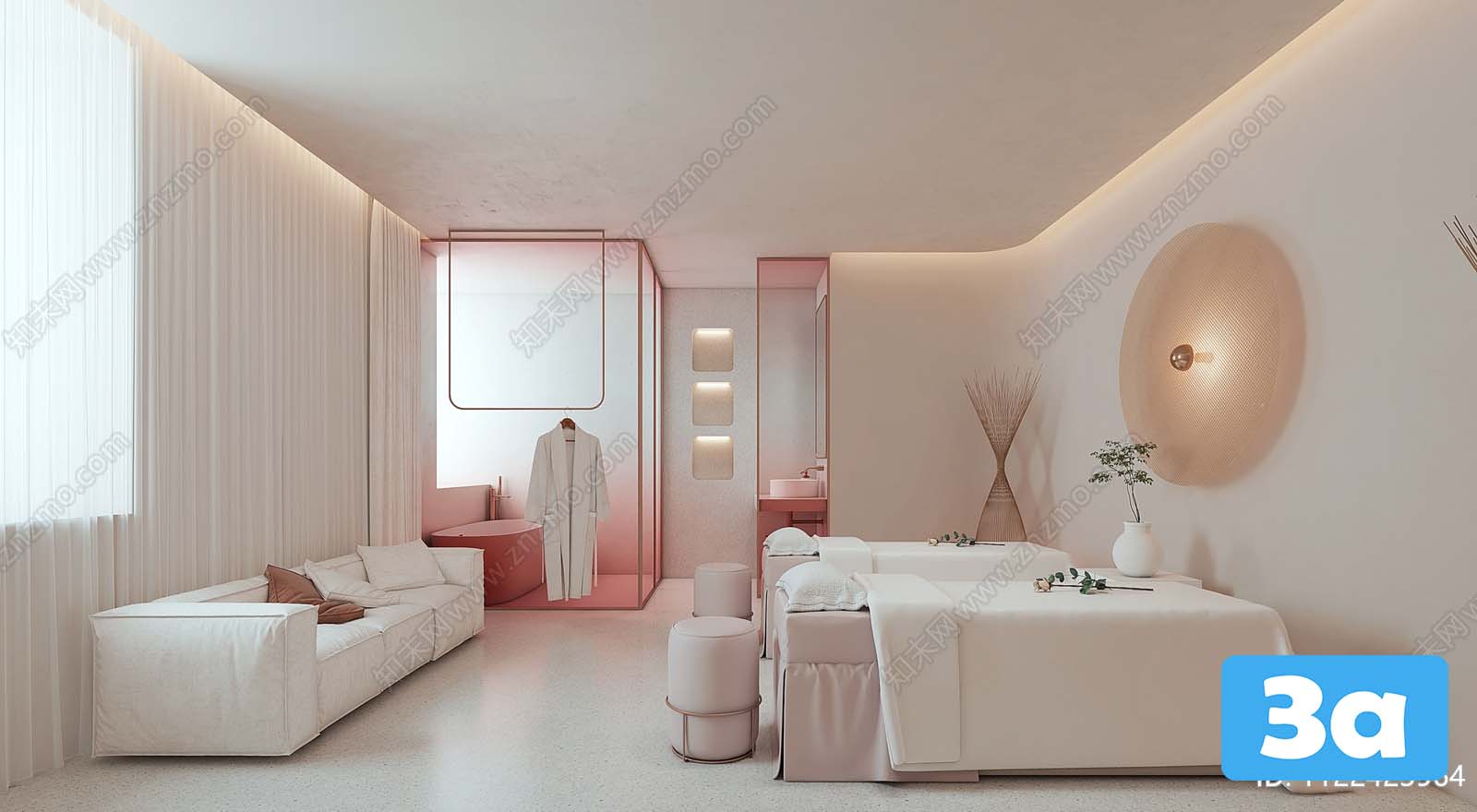 This 3D scene showcases a spa environment designed for relaxation and rejuvenation. The serene setting and intricate details create a perfect space for unwinding and pampering yourself. Explore the beauty of this visualization and get inspired for your own interior design projects.