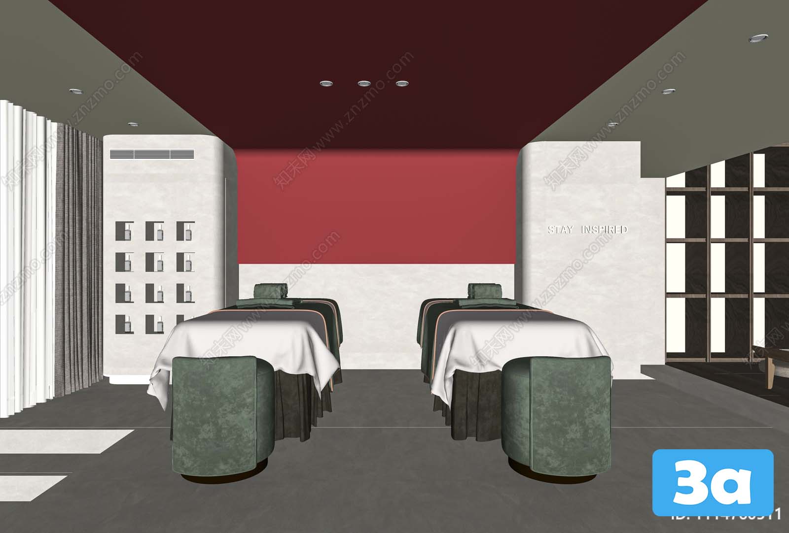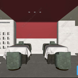 This 3D scene depicts a spa environment designed for relaxation and tranquility. The visualization captures the serene atmosphere of a spa, with detailed elements that enhance the overall experience. Explore this 3D scene to immerse yourself in a calming and peaceful setting.