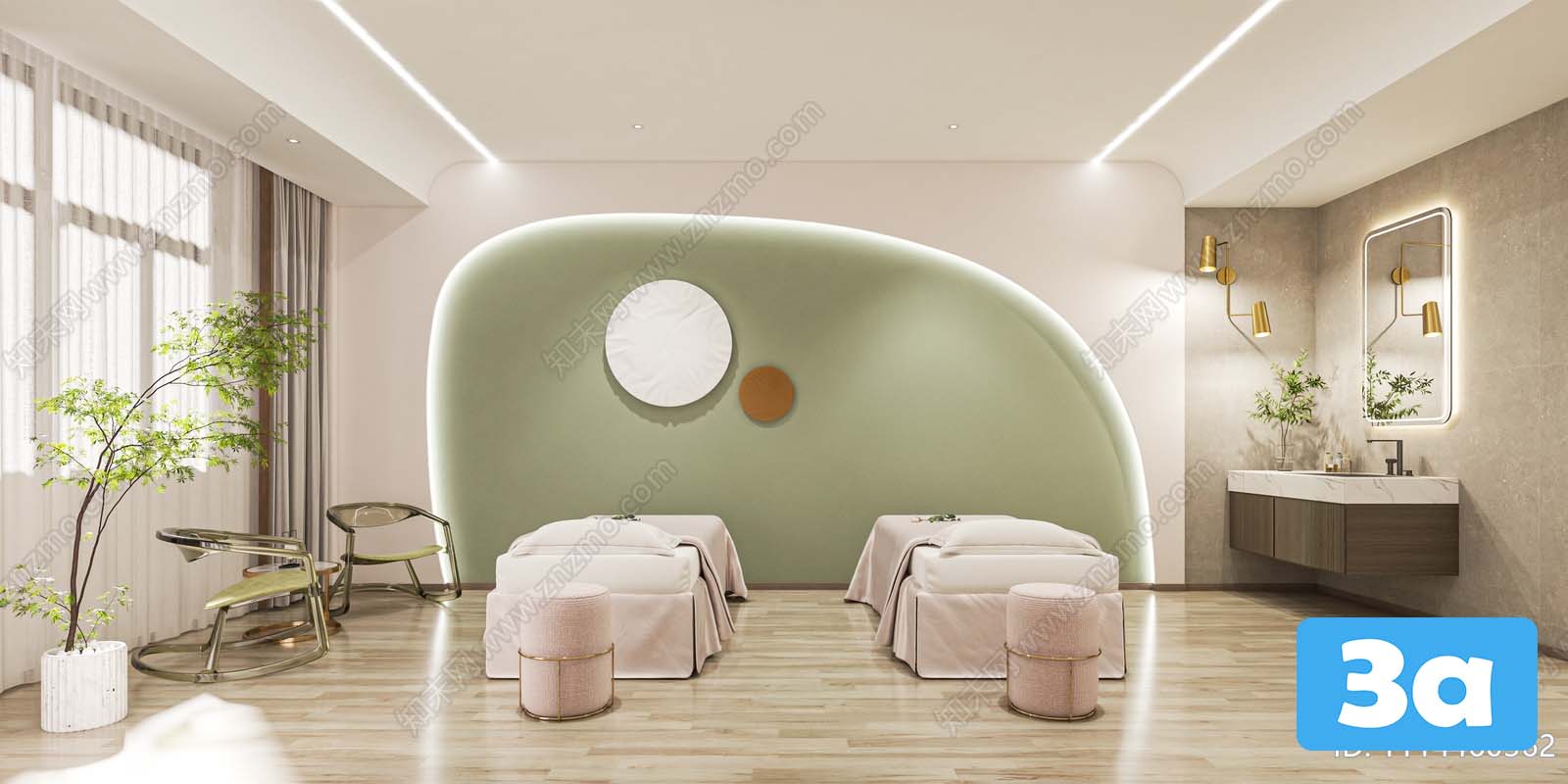This 3D scene depicts a luxurious spa environment with a focus on relaxation and tranquility. The intricate details and serene ambiance create a visually appealing space for unwinding and rejuvenation. Explore this visualization to get inspired for your own spa design projects.