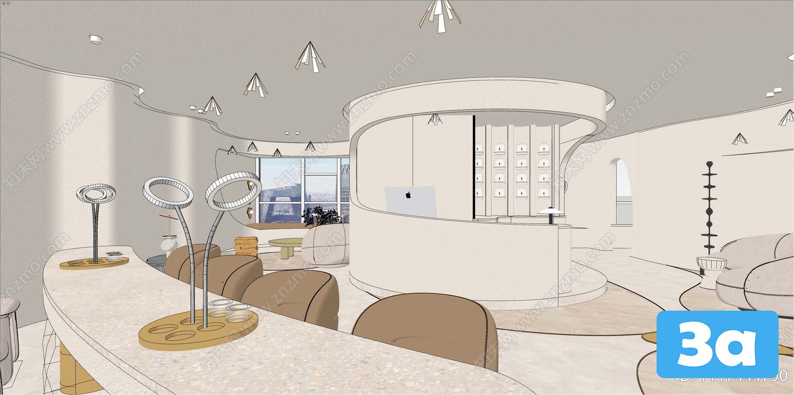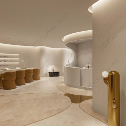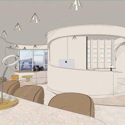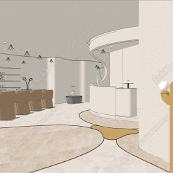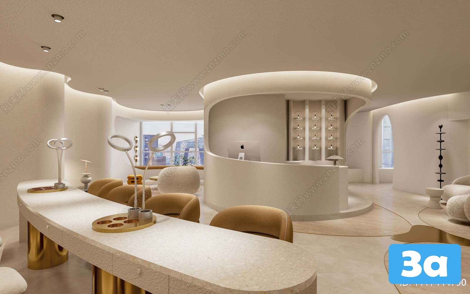 This 3D scene depicts a spa environment with a focus on relaxation and modern design. The visualization showcases a serene setting with elements such as a spa pool, lounge chairs, and lush greenery. The design features a harmonious blend of natural textures and contemporary aesthetics, creating a tranquil space for relaxation and rejuvenation.