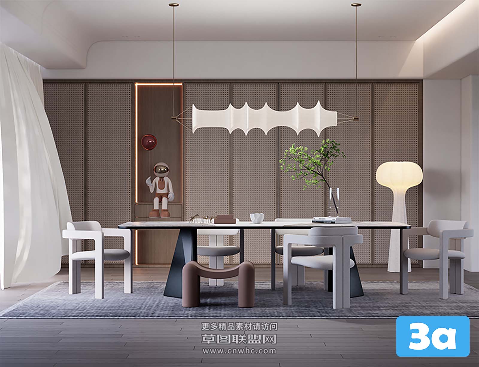 This 3D scene features a virtual reality dining room with a modern and stylish interior design. The room includes a sleek dining table, elegant chairs, contemporary lighting fixtures, and tasteful decor. Perfect for inspiration and visualization in interior design projects.