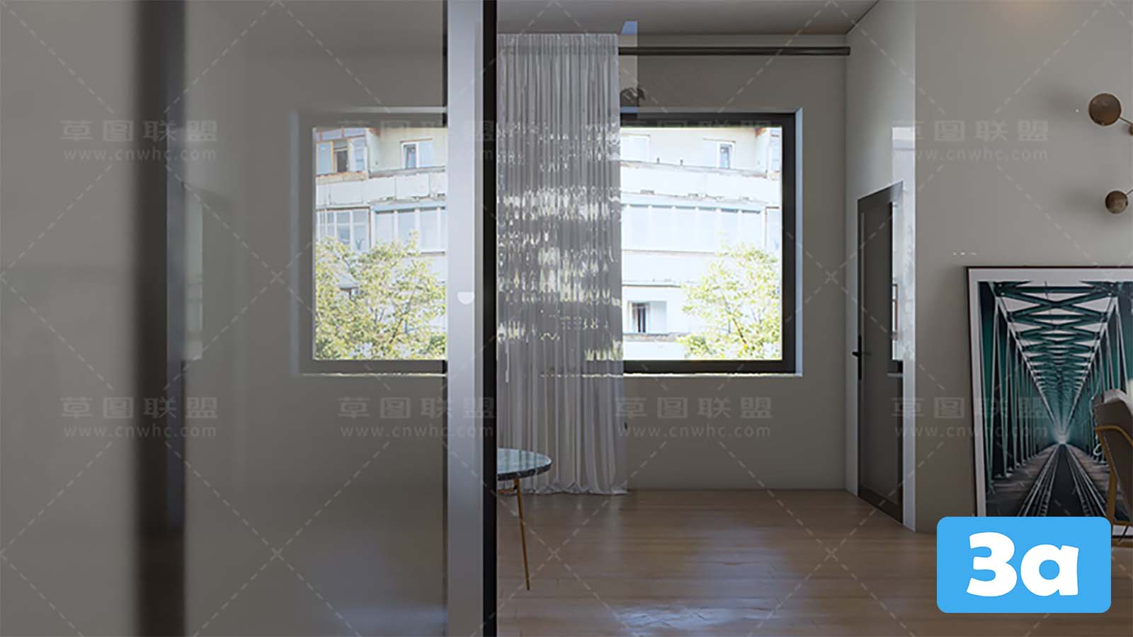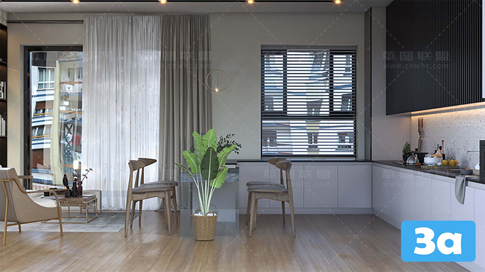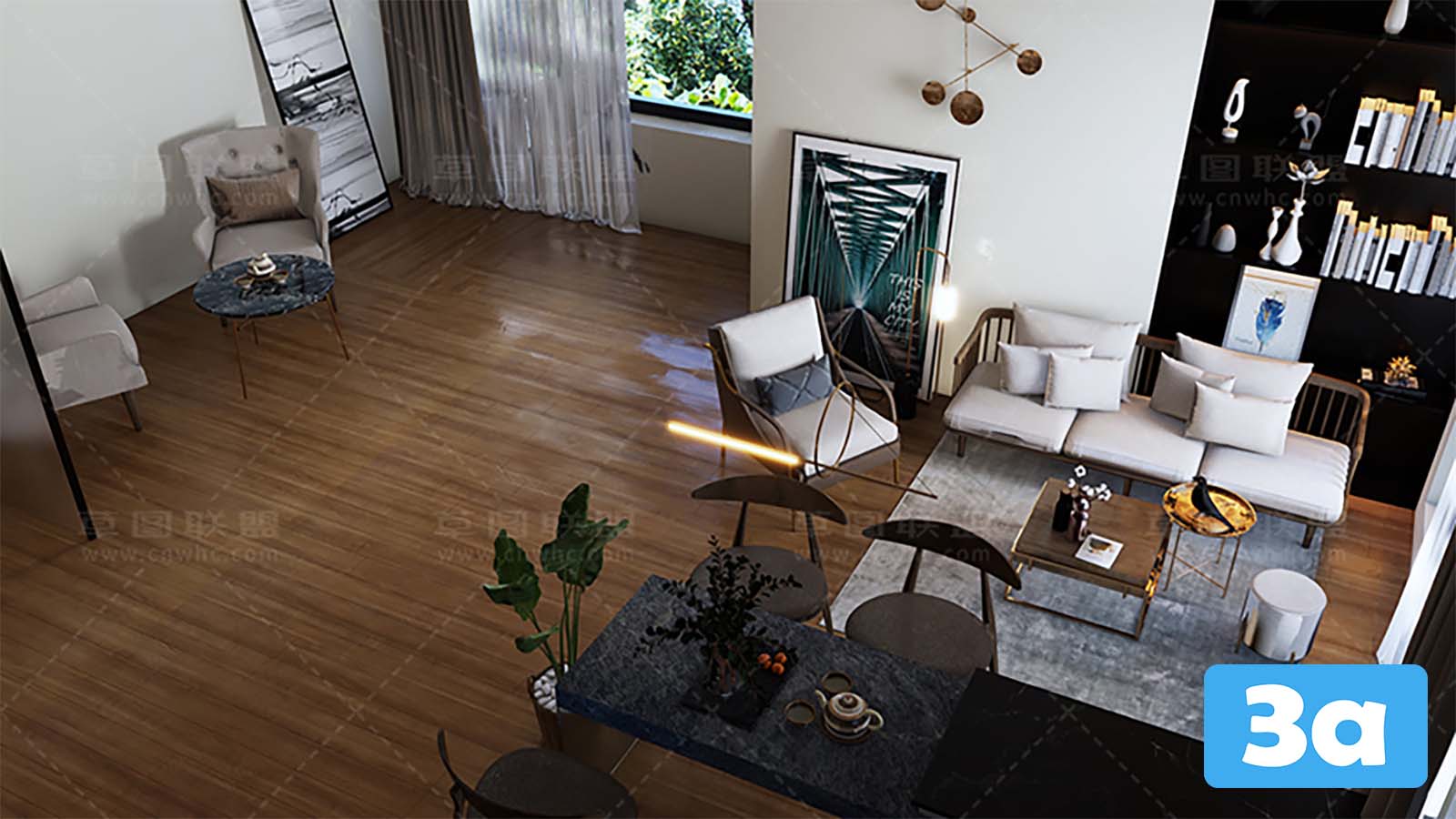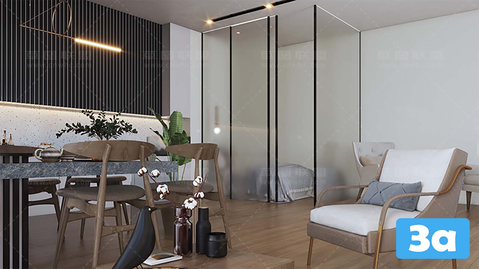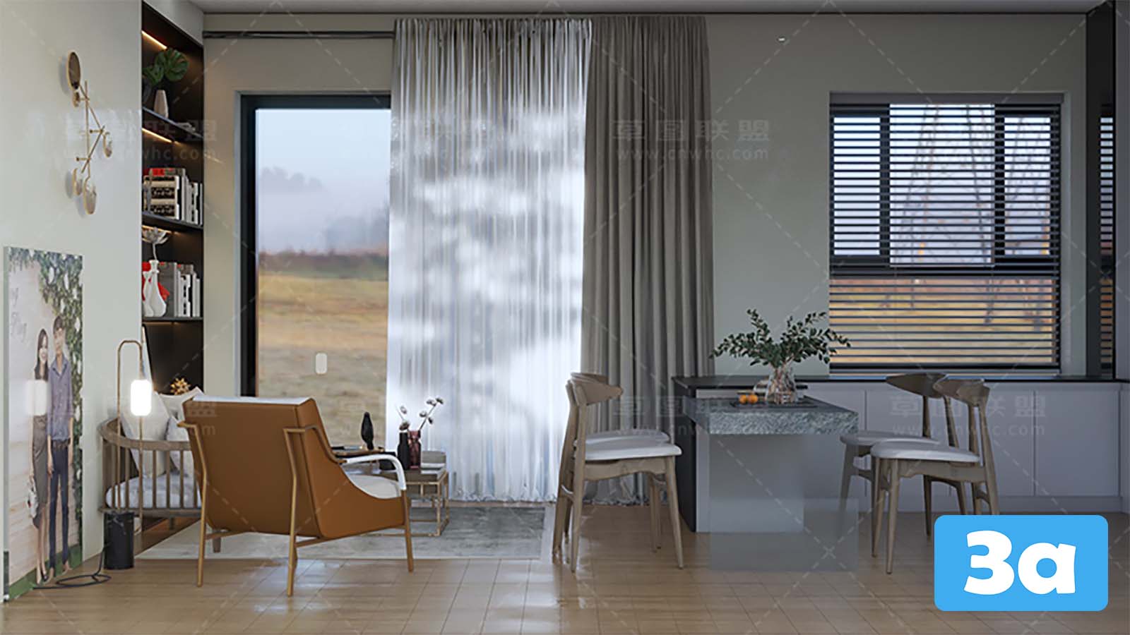 This 3D scene showcases a virtual reality dining room with modern interior design. Step into a realistic and immersive experience with this virtual reality setup. The room features contemporary furniture and decor, creating a stylish and inviting space for dining and entertainment. Explore the details of the room and get inspired for your own interior design projects.