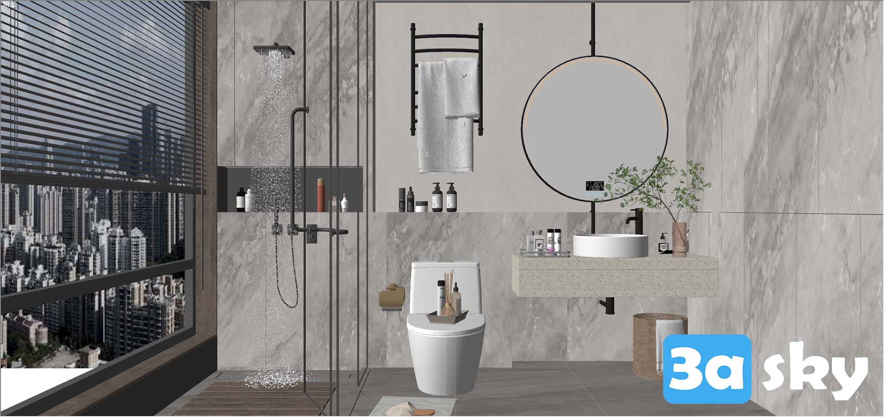This 3D scene features a detailed WC Sketchup model, ideal for architectural visualization and interior design projects. The model includes elements such as a toilet, sink, and other bathroom fixtures. Perfect for creating realistic renderings and visualizations.