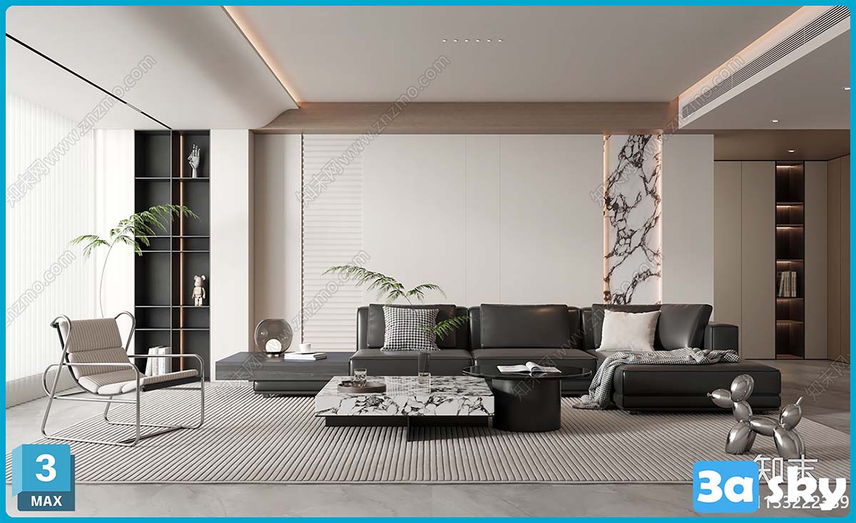 This 3D scene showcases a modern living room interior design, featuring a perfect blend of contemporary style and functionality. Explore the details and design elements in this captivating visualization.