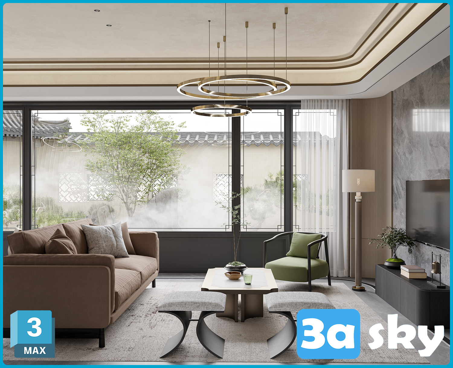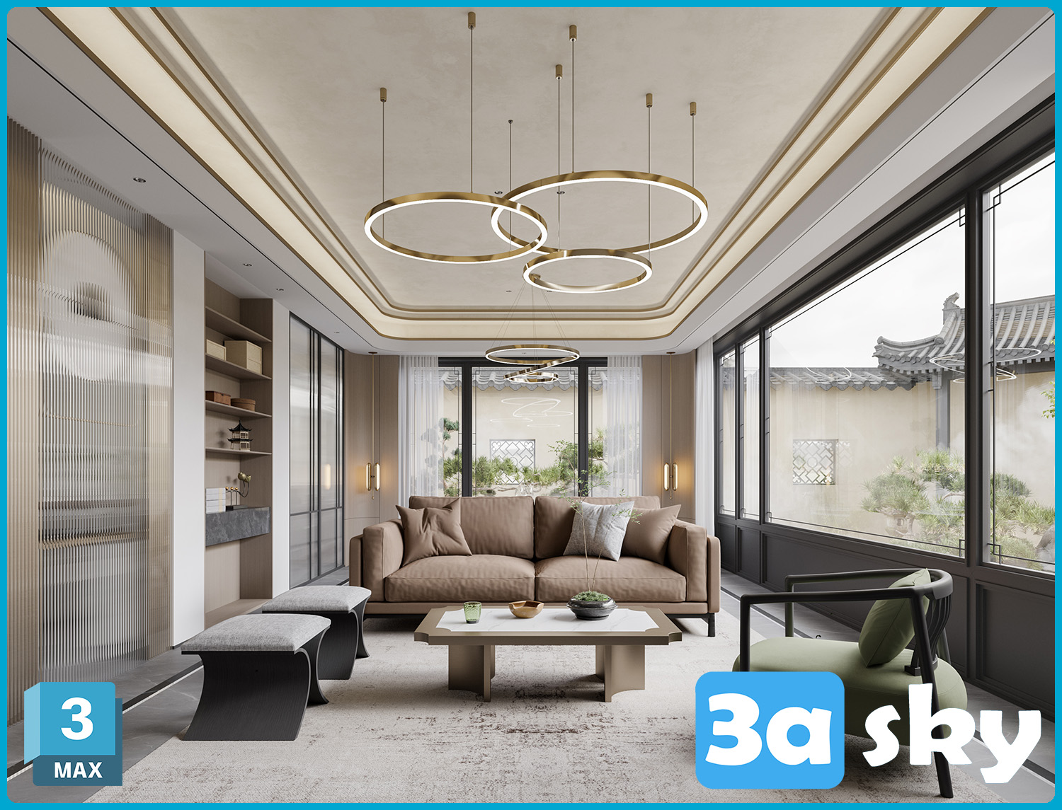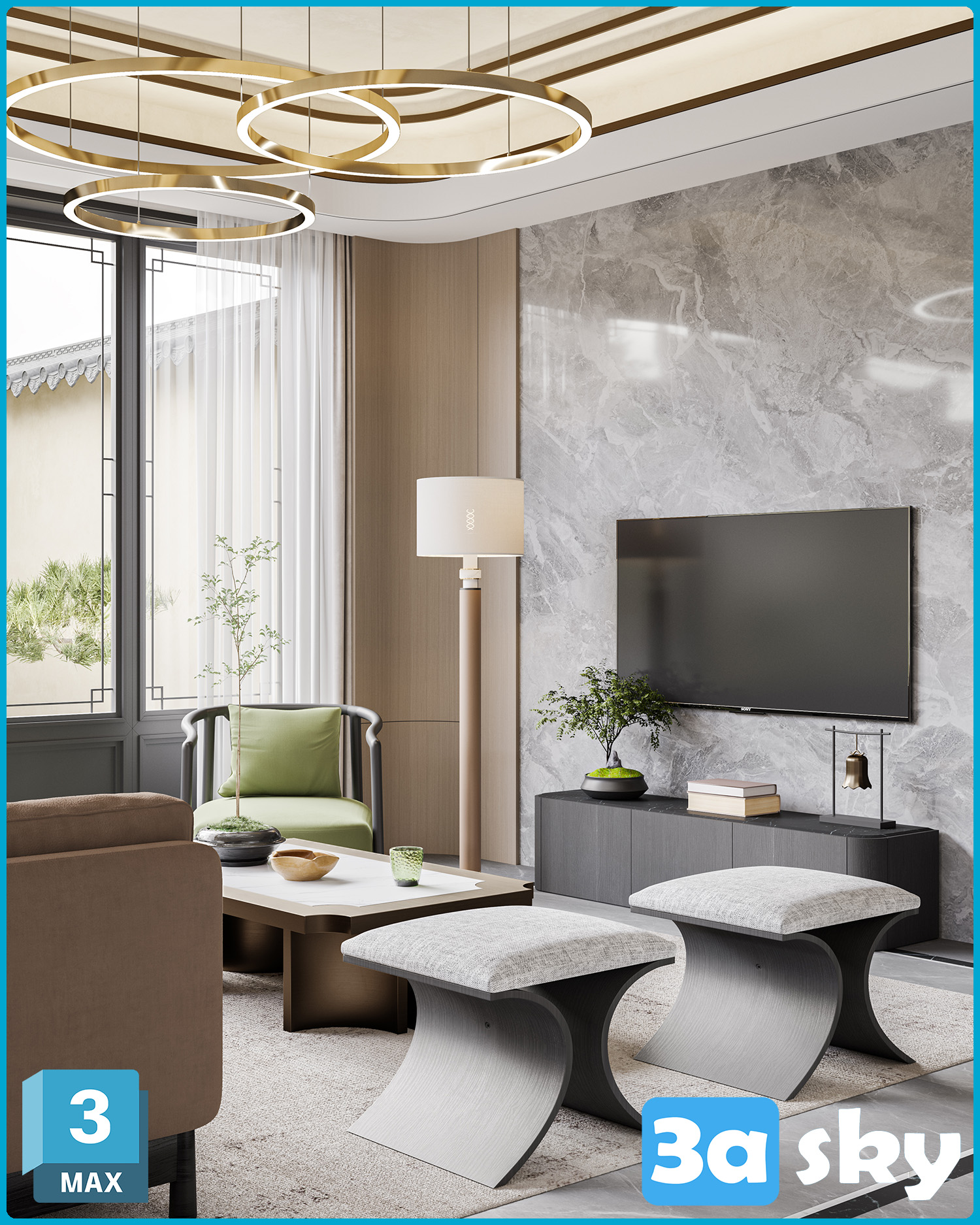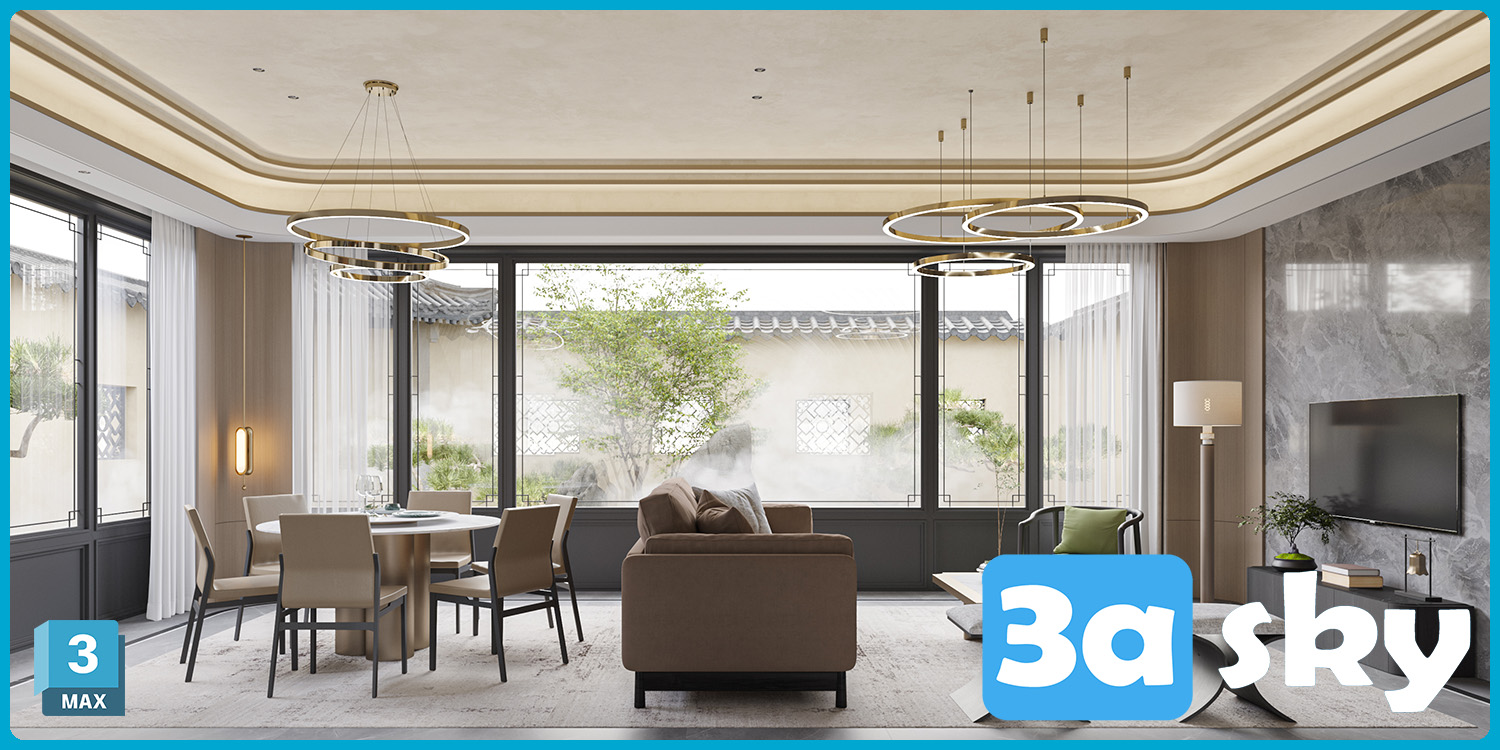 This 3D scene showcases a modern living room interior design with contemporary furniture and stylish decor. Explore high-quality 3D models and scenes in our library for your architectural and interior design projects.