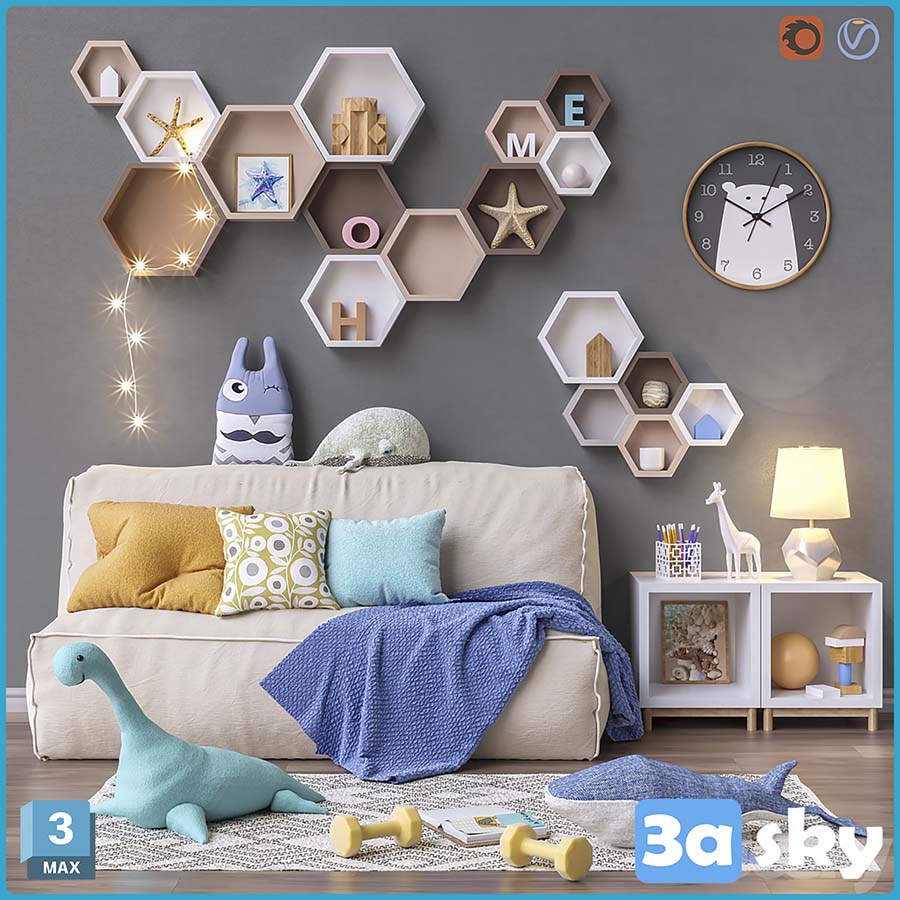This 3D model features a collection of toys and furniture suitable for kids' rooms. Created in 3DS MAX, this set includes various items such as toy cars, dolls, and miniature furniture pieces. Ideal for interior design projects or educational purposes.