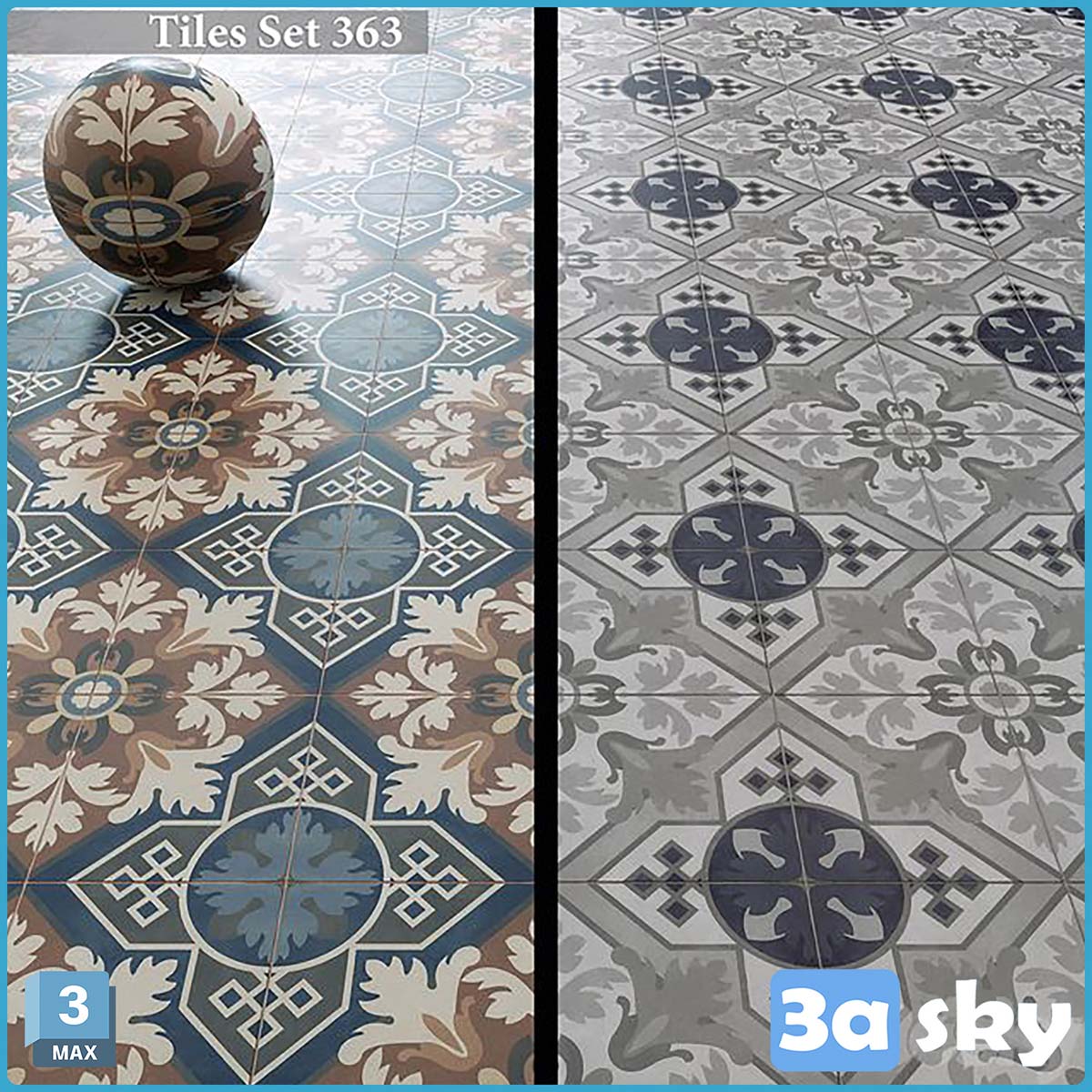 This image showcases the Tiles Set 363 preview from 3DS MAX/DECORATION. It features intricate and detailed design elements suitable for interior decoration projects. Explore the beauty and creativity of this 3D model in the world of interior design.