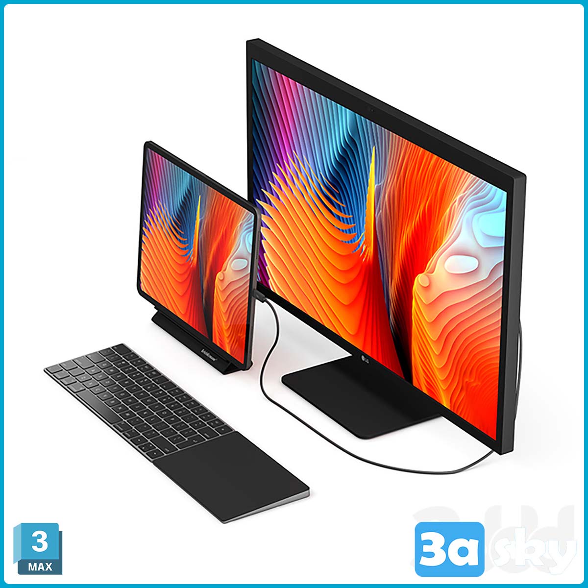 This 3DS MAX/DECORATION image showcases a modern interior design featuring an iPad Pro and LG UltraFine monitor. The attention to detail and technology integration make it a perfect addition to any design project.