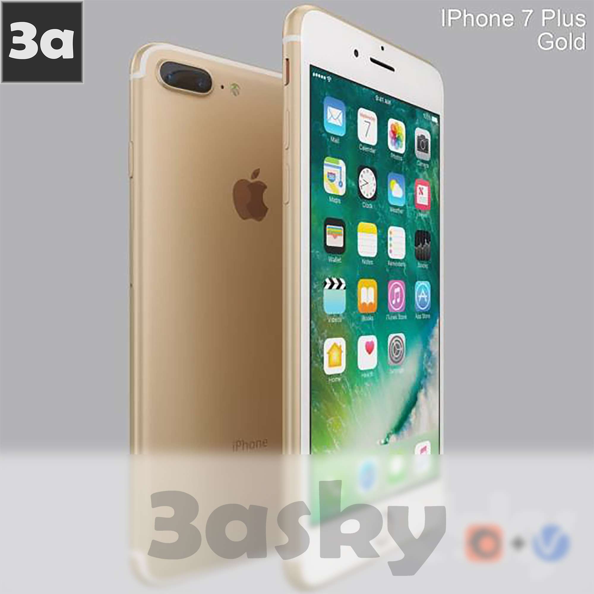 This image showcases the iPhone 7 Plus Gold model created using 3DS MAX software. The intricate details and design elements are highlighted in this 3D rendering, providing a closer look at the decoration and aesthetics of the model.