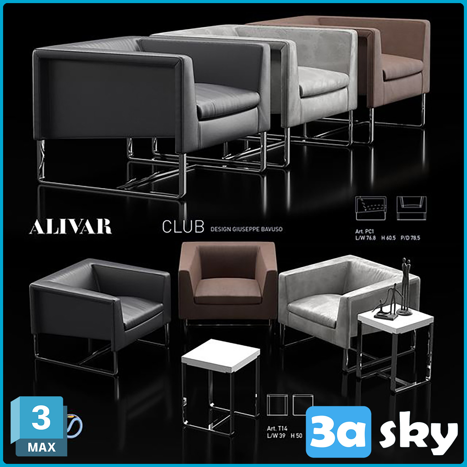 This 3D model features the Alivar Club Set, a contemporary and elegant furniture design suitable for various interior design projects. The set includes a sofa, armchair, and coffee table, all crafted with attention to detail and quality. Perfect for adding a touch of sophistication to your 3D visualizations and architectural renderings. Download this high-quality furniture model for your next project.
