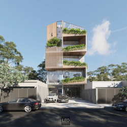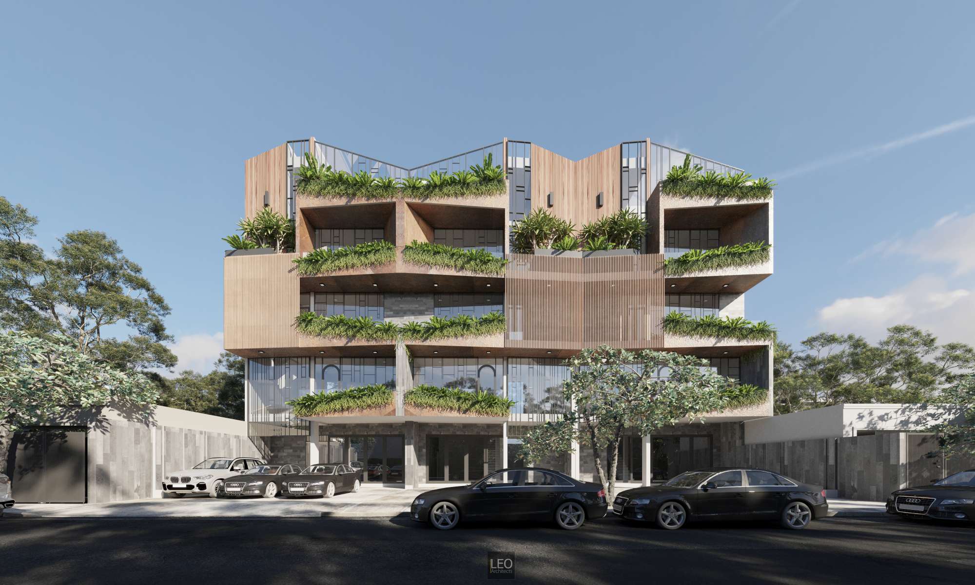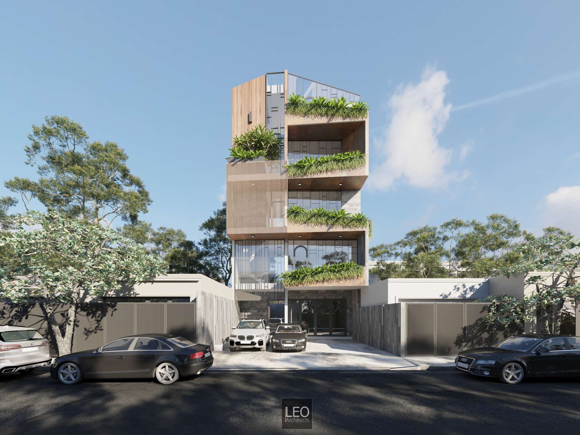 This 3D scene showcases a modern architectural design with a focus on urban aesthetics. The building features sleek lines and contemporary elements, creating a visually striking composition. Explore the exterior details and cityscape in this preview image.