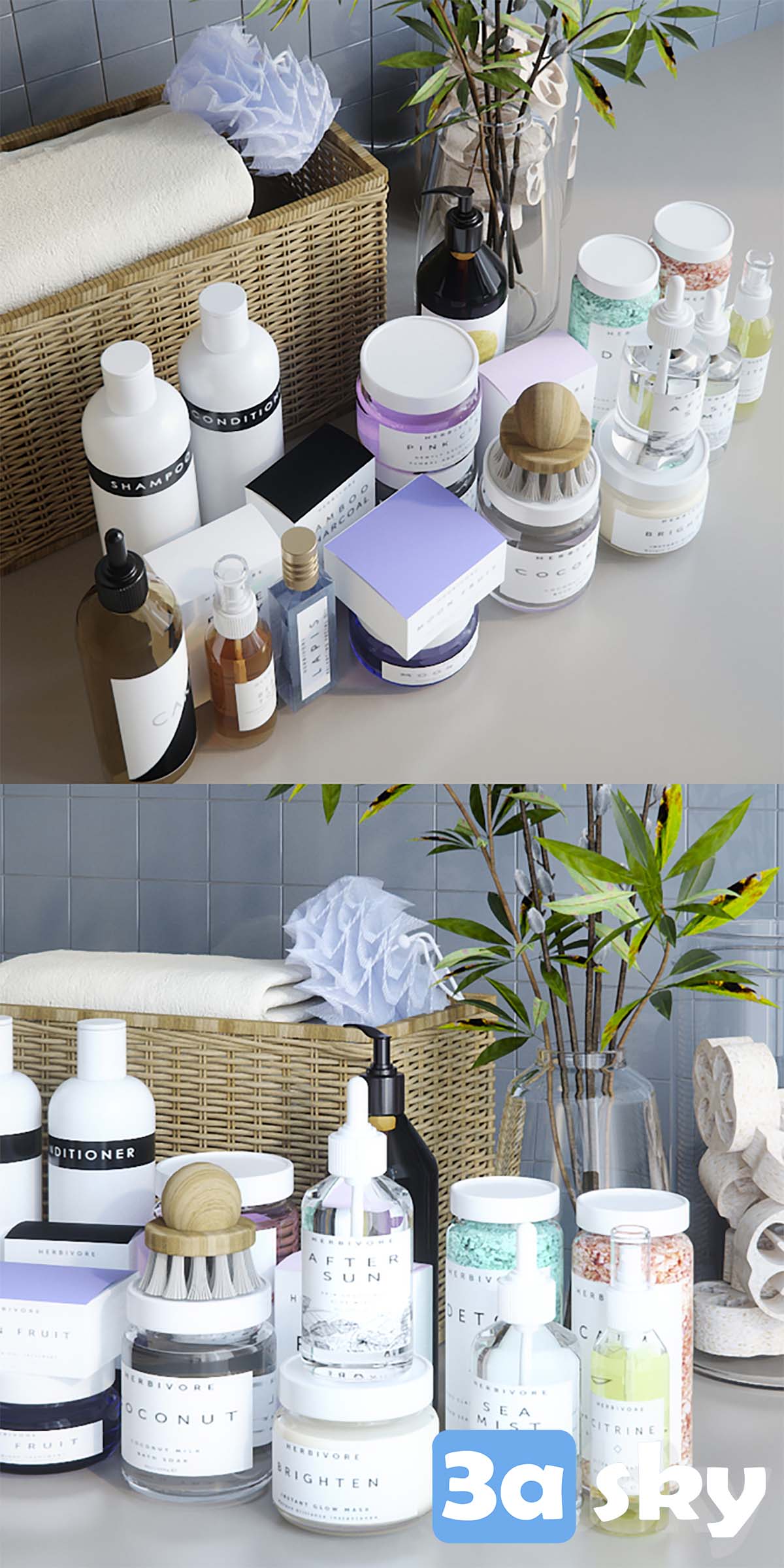 This 3D model preview showcases a set of cosmetics designed for the bathroom and WC. The image provides a detailed look at the arrangement and design of various cosmetic items, offering insights into their placement and aesthetic appeal.