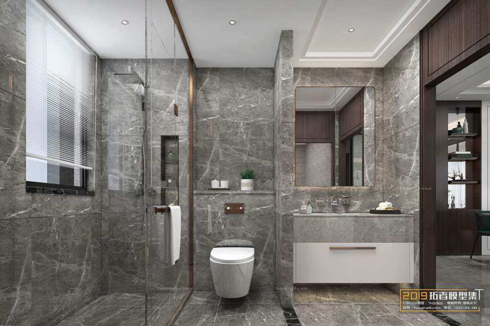 This 3D scene showcases a modern and stylish bathroom space with design elements that exude elegance and functionality. The scene features contemporary fixtures and fittings, creating a luxurious ambiance. Explore the intricate details and thoughtful layout of this bathroom space, perfect for inspiration in interior design projects.