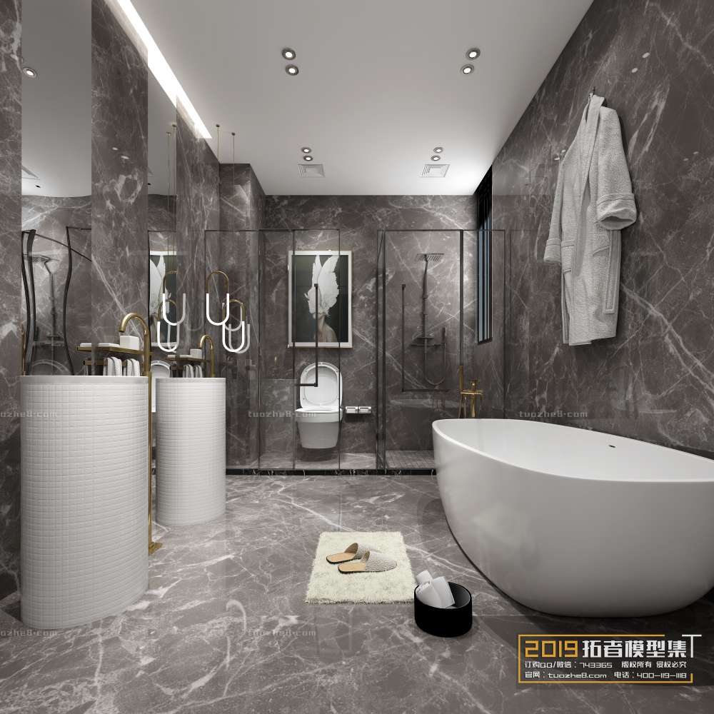 This 3D scene showcases a modern bathroom space with a sleek design. The layout features contemporary elements and a stylish aesthetic. Explore the intricate details and design choices in this captivating 3D rendering.