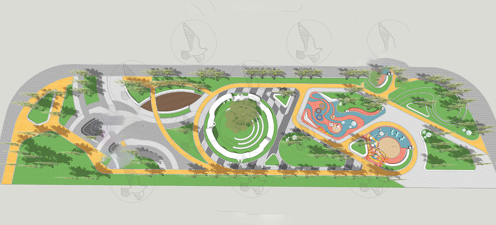 This 3D scene model showcases a beautiful park setting with lush greenery, trees, benches, and winding pathways. Ideal for architectural visualization and landscape design projects. Created in Sketchup software.