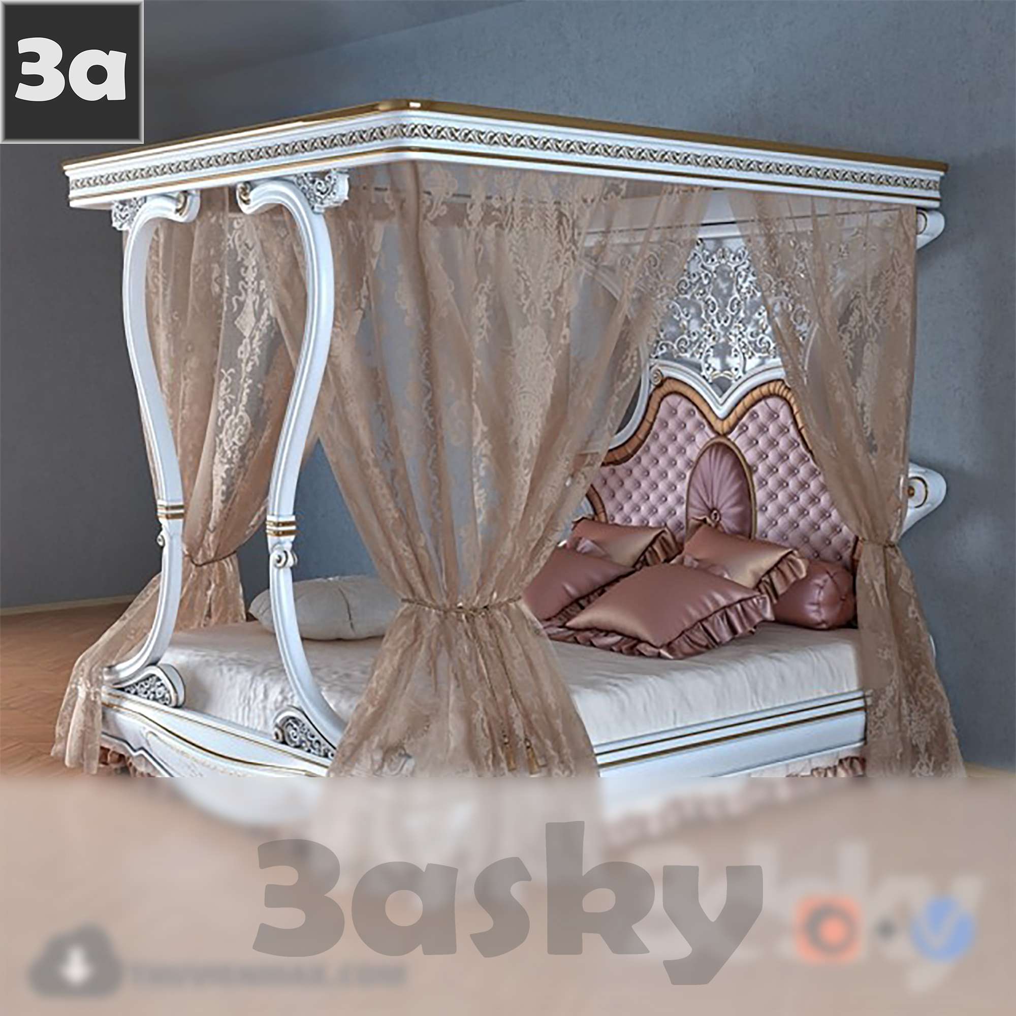 This 3D model showcases a beautifully designed bed with a canopy, suitable for interior design projects. The file is created in 3DS MAX and offers intricate details for realistic visualization. Enhance your furniture design concepts with this elegant piece.