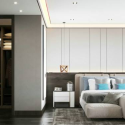 This 3D scene features a modern bedroom interior design created in 3DS MAX. The render showcases high quality details of the furniture and overall layout. Perfect for interior design enthusiasts and professionals looking for inspiration.
