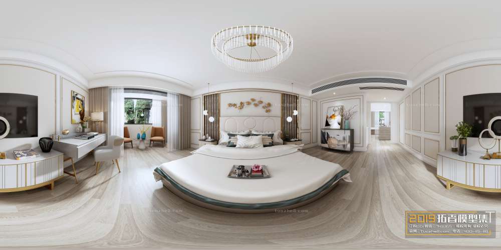 This 3D scene showcases a bedroom designed in American style. The room features elegant furniture and decor elements that create a cozy and inviting atmosphere. Perfect for interior design enthusiasts and professionals looking for inspiration.