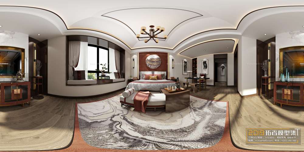 This 3D scene showcases a bedroom designed in a Chinese style, featuring intricate details and elegant furniture. Explore the blend of traditional Chinese elements with modern design concepts in this visually stunning representation.
