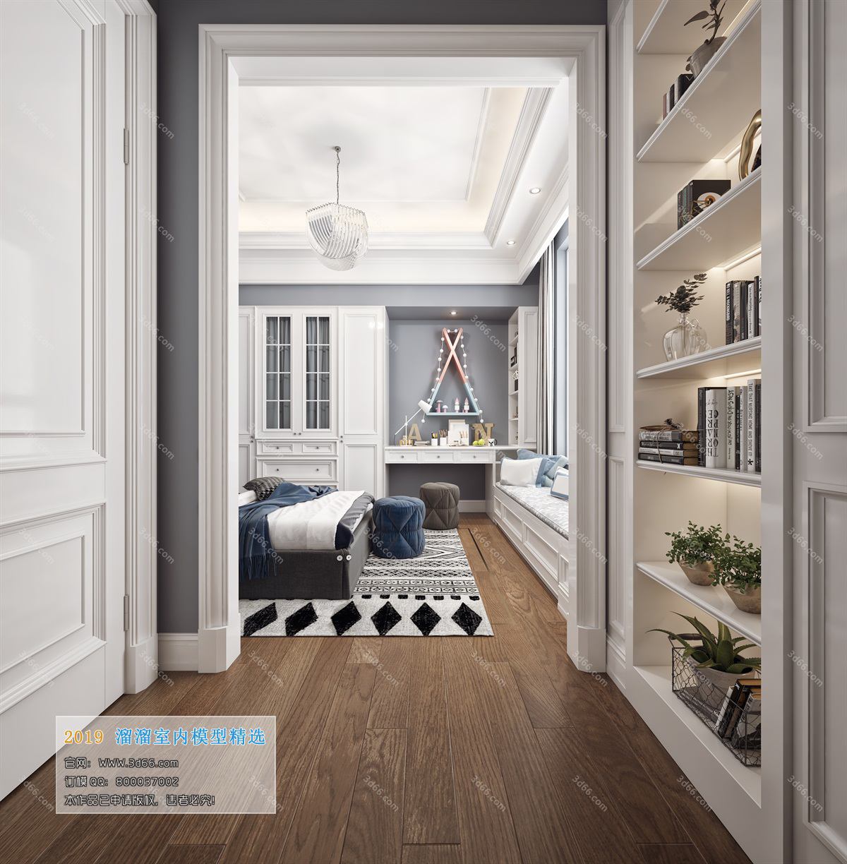 This 3D scene showcases a bedroom space designed in American style. The interior features elegant furniture and decor elements that create a cozy and inviting atmosphere. Explore the layout and design details of this room for inspiration in your own interior design projects.