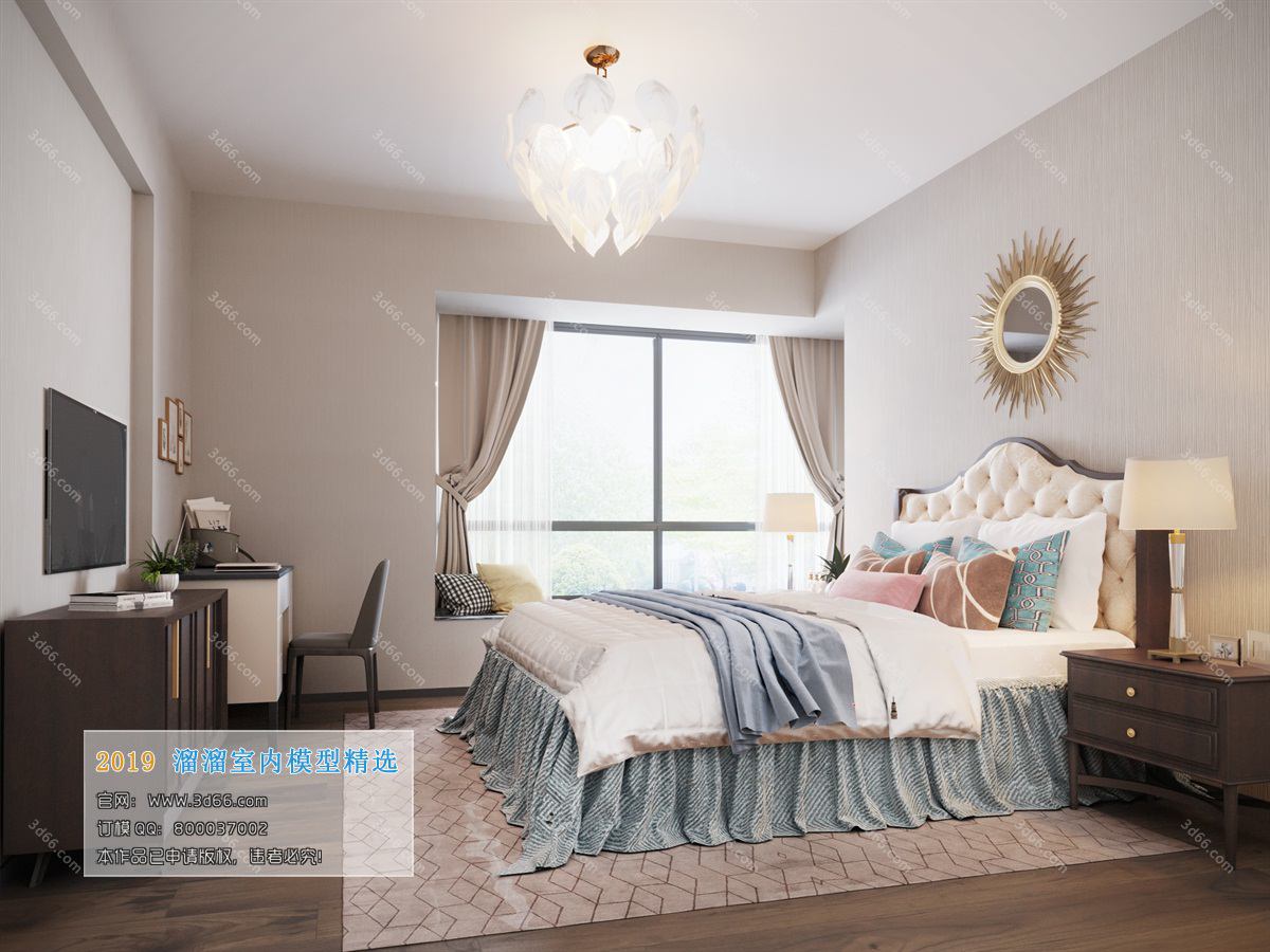 This 3D scene showcases a bedroom space designed in American style. The room features modern furniture and decor elements that create a cozy and stylish ambiance. Explore the details of the interior design and get inspired for your own projects.