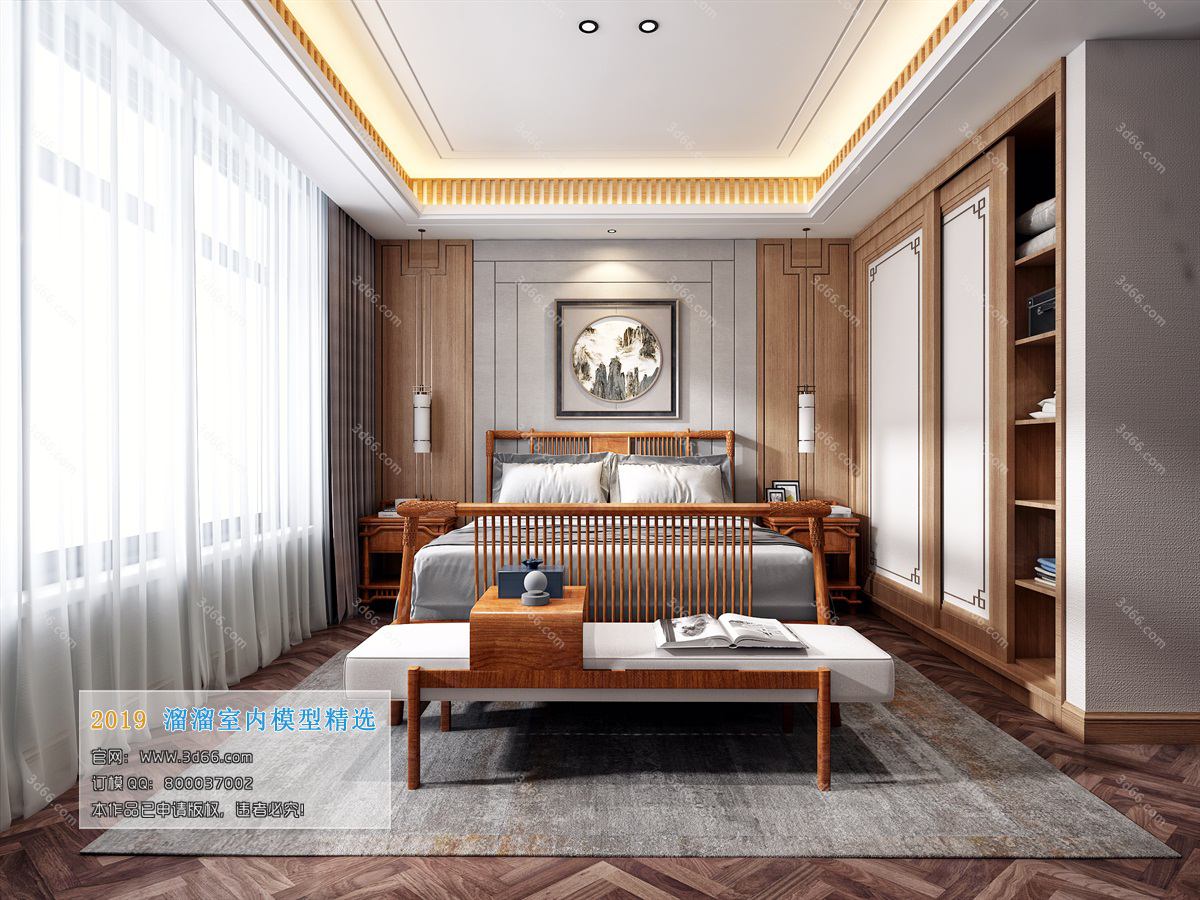 This 3D scene showcases a bedroom space designed in a Chinese style. The room features traditional Chinese furniture and decor, creating a serene and elegant atmosphere. Explore the intricate details and design elements in this beautifully crafted space.