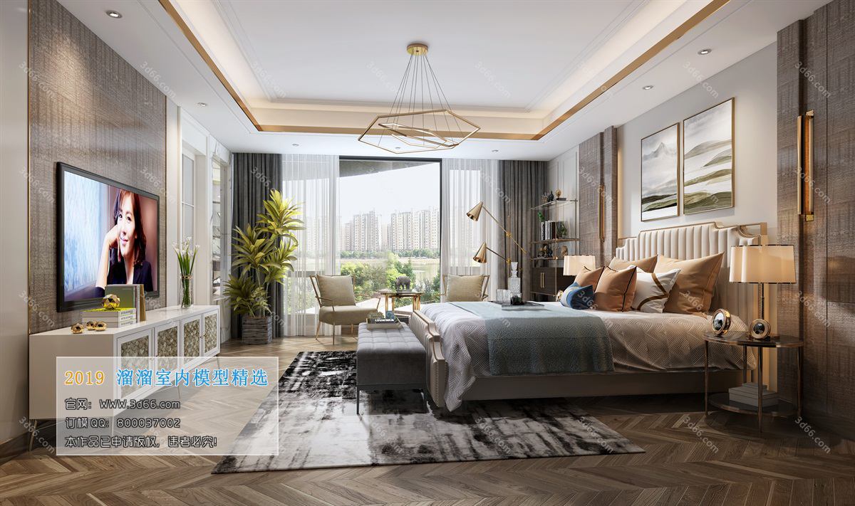 This 3D scene showcases a bedroom space designed in postmodern style, featuring modern furniture and decor elements. Experience the blend of contemporary design with postmodern aesthetics in this visually appealing setting.